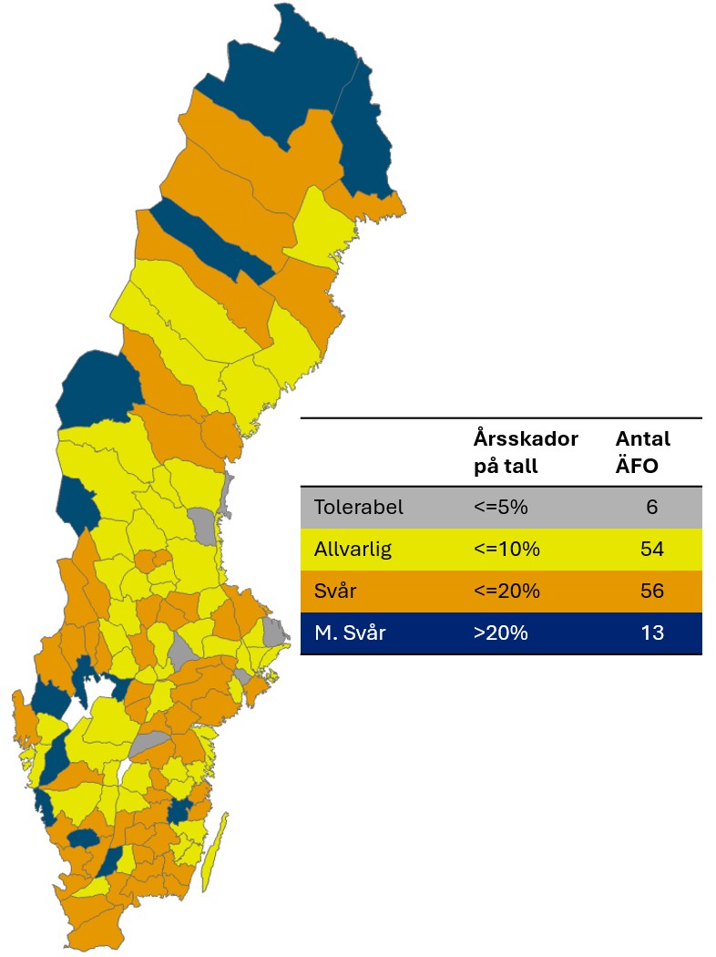 Bryts siffrorna ned på landets älgförvaltningsområden så ligger skadorna på mellan 5 och 20 procent i de flesta områden. Endast sex områden i landet ligger inom målet för en tolerabel skadenivå som är maximalt fem procent.