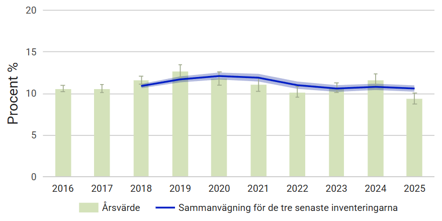 Skadenivåerna varierar samtidigt över landet. Södra Norrland (Västernorrland, Jämtland och Gävleborgs län) visar på de lägsta skadorna sedan 2016, då resultaten började presenteras i sin nuvarande form, och har över tid minskat från 14 till 8 procent. Norra Norrland (Norrbotten och Västerbotten) visar också den lägsta nivån sedan 2016 med 10 procents skador, men det behövs längre tidsserier för att veta om nedgången i Norra Norrland är ett långsiktigt trendbrott.