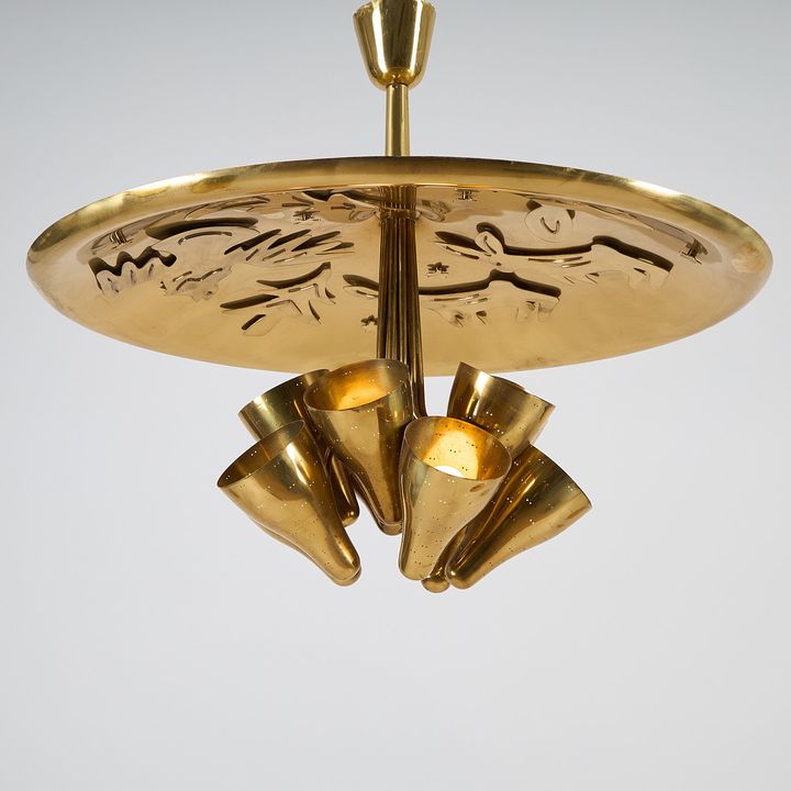Ceiling lamp 9018 consists of ten perforated lampshades in polished brass, mounted on a ceiling fixture with figurative decoration. The animal motifs were designed by Paavo Tynell's wife, Helena Tynell, and were used for the bar ceiling lamps and as well as other furnishings throughout the restaurant interior. The ceiling lamps features stylized hares, foxes, moose, bears, capercaillies, fir trees and stars – Finnish nature exoticism in a modernist outfit.