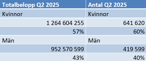 Det är fortsatt både män och kvinnor som använder sig av rut, men uttaget sker främst av kvinnor. Under andra kvartalet använde kvinnor sig av rut vid 641 000 tillfällen, 60 procent av de totala tillfällena. Totalt sett har rut använts vid 1 061 220 tillfällen.