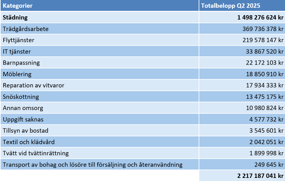Efter ett positivt första kvartal fortsätter 2025 att vara ett starkt år för användandet av rut-tjänster. I det andra kvartalet har rut använts 41 000 fler gånger än samma period 2024. Det är en ökning med drygt 4 procent. Totalt köptes det rut-tjänster för 2 217 184 586 kr under april-juni. En ökning med 9,3 procent jämfört med 2024. Enbart i juni ökade uttaget av rut med 18 procent. Jämfört med första kvartalet 2025 har användandet ökat mer, första kvartalet ökade det bara 2 procent i antal och 9,5 i totalsumma jämfört med 2024.