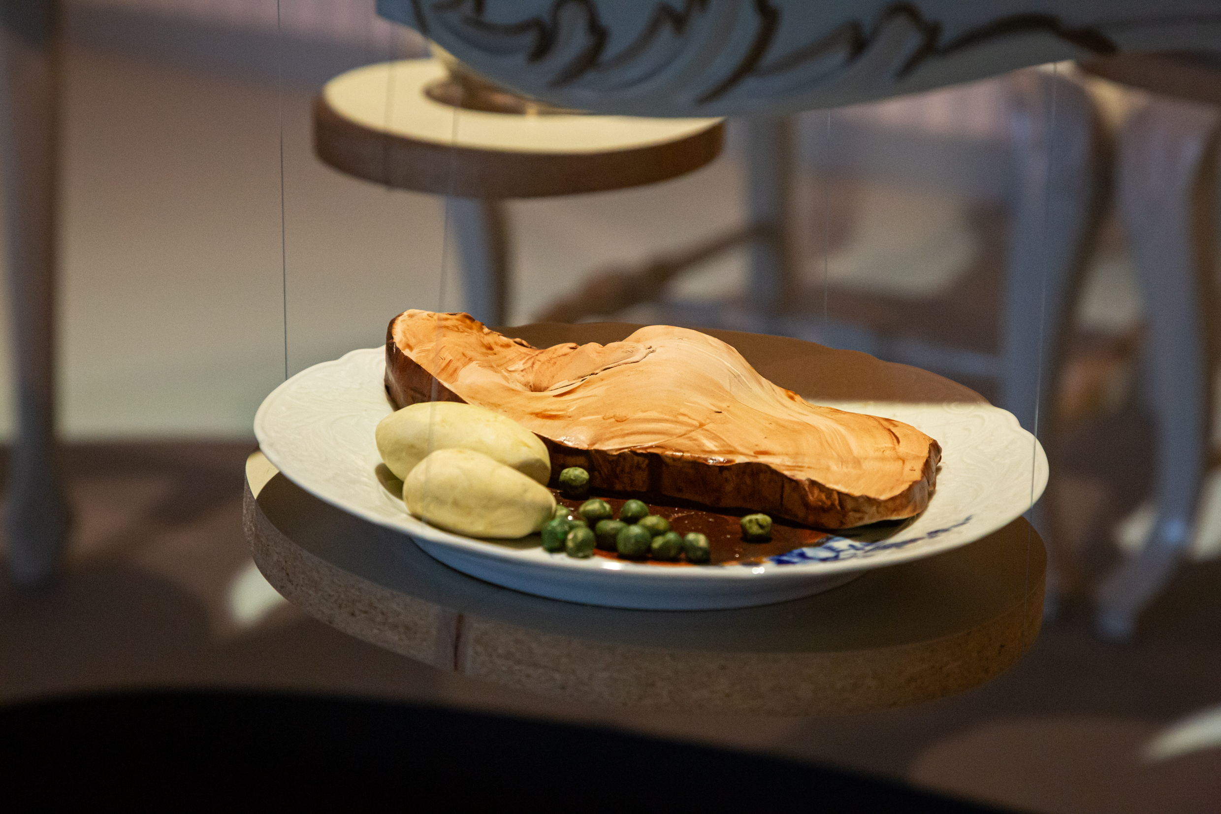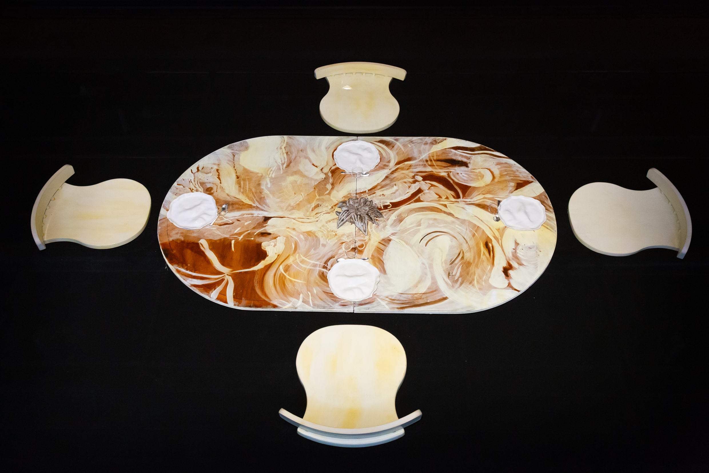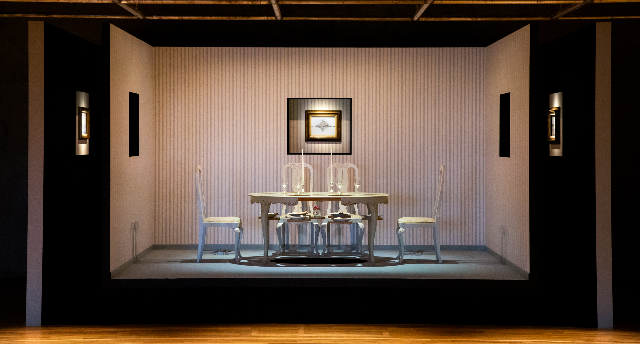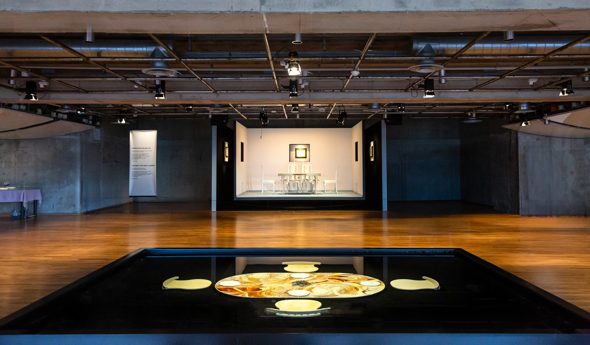 Centralt i utställningen står titelverket Festen som inte blev av – ett rum där ett dukat bord står kvar, urgröpt med håligheter där tallrikarna har sjunkit ner genom skivan. En rörelse har skett, men lämnat efter sig tystnad. Det är ett fruset ögonblick av något som aldrig riktigt hände.