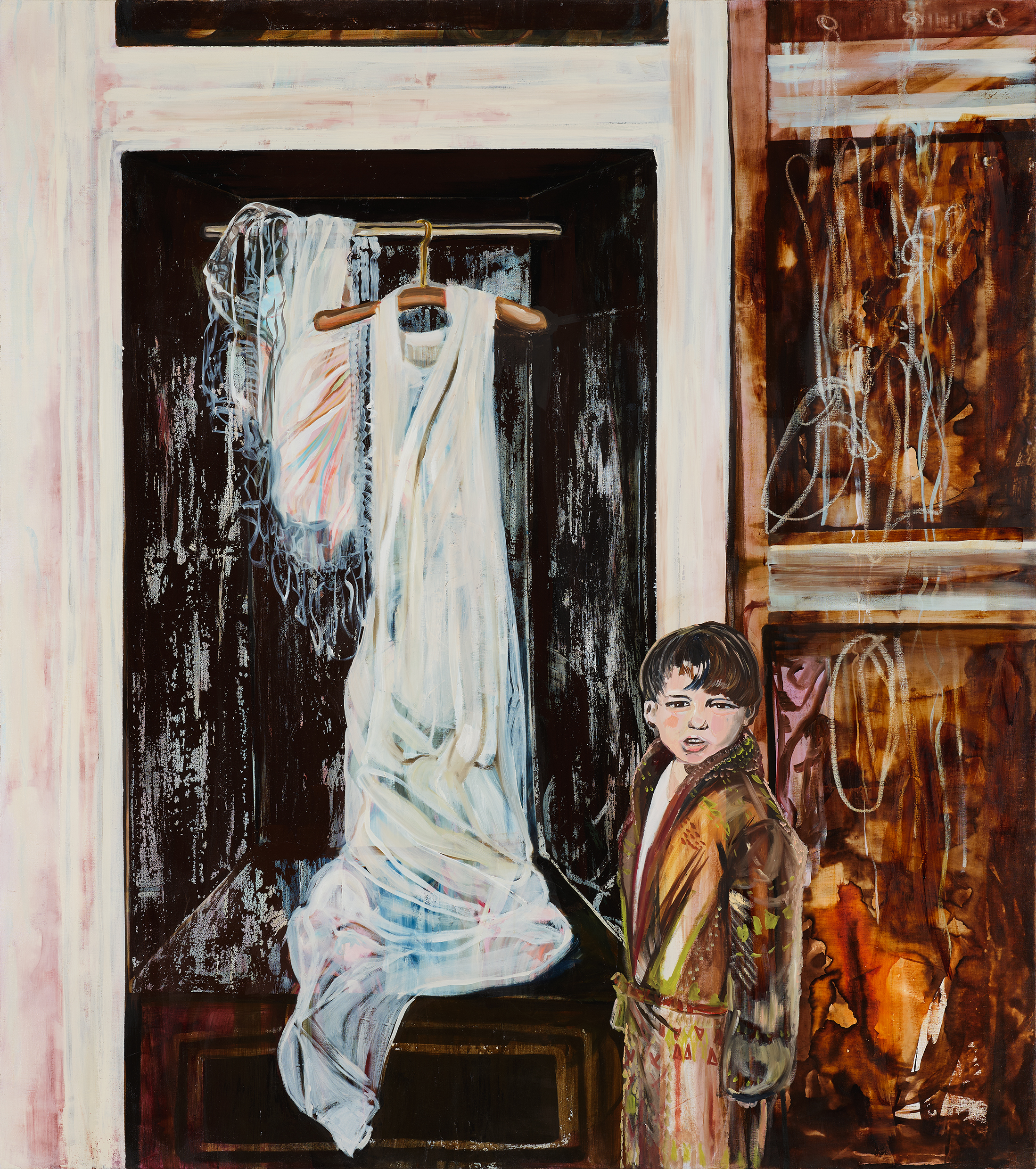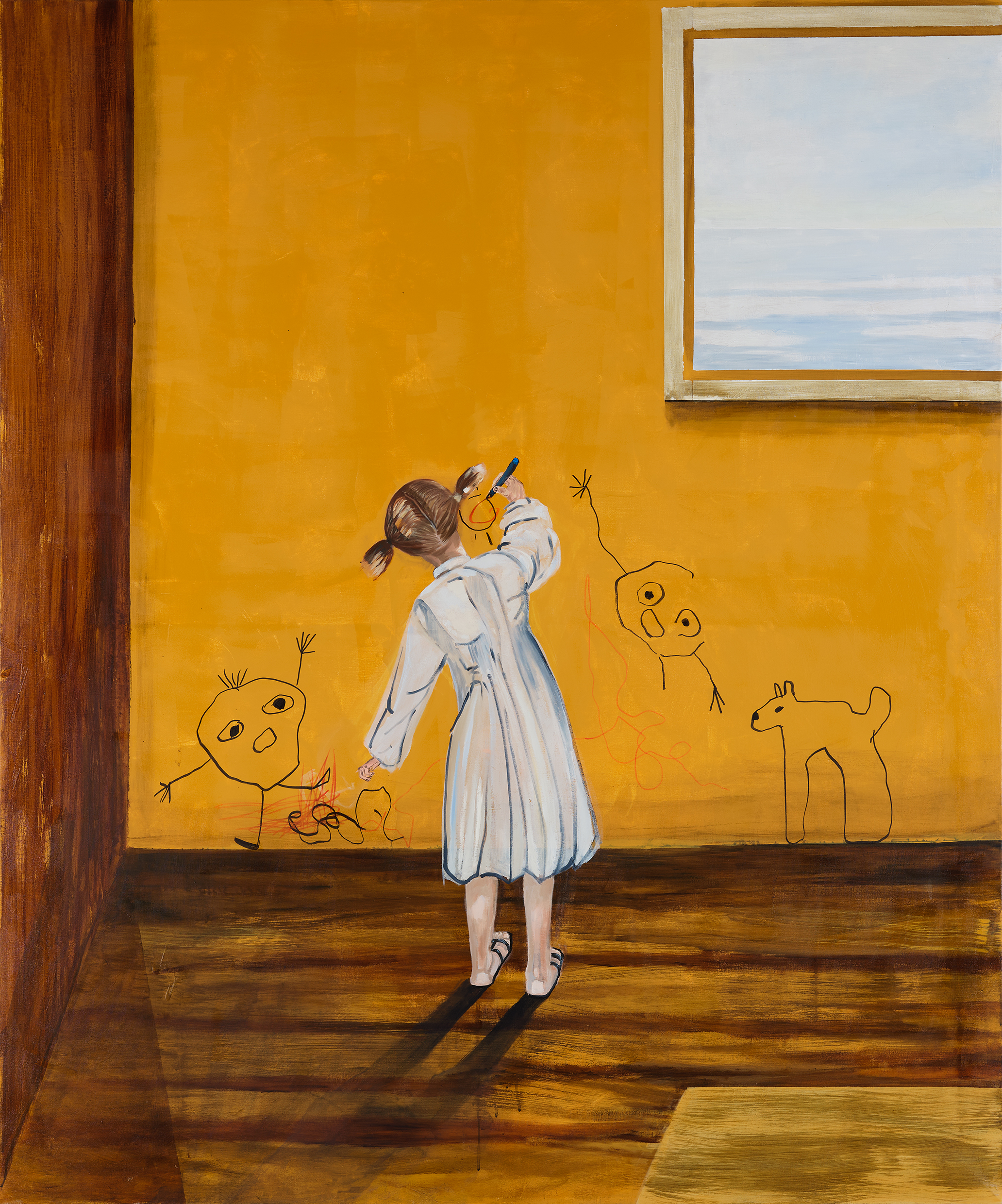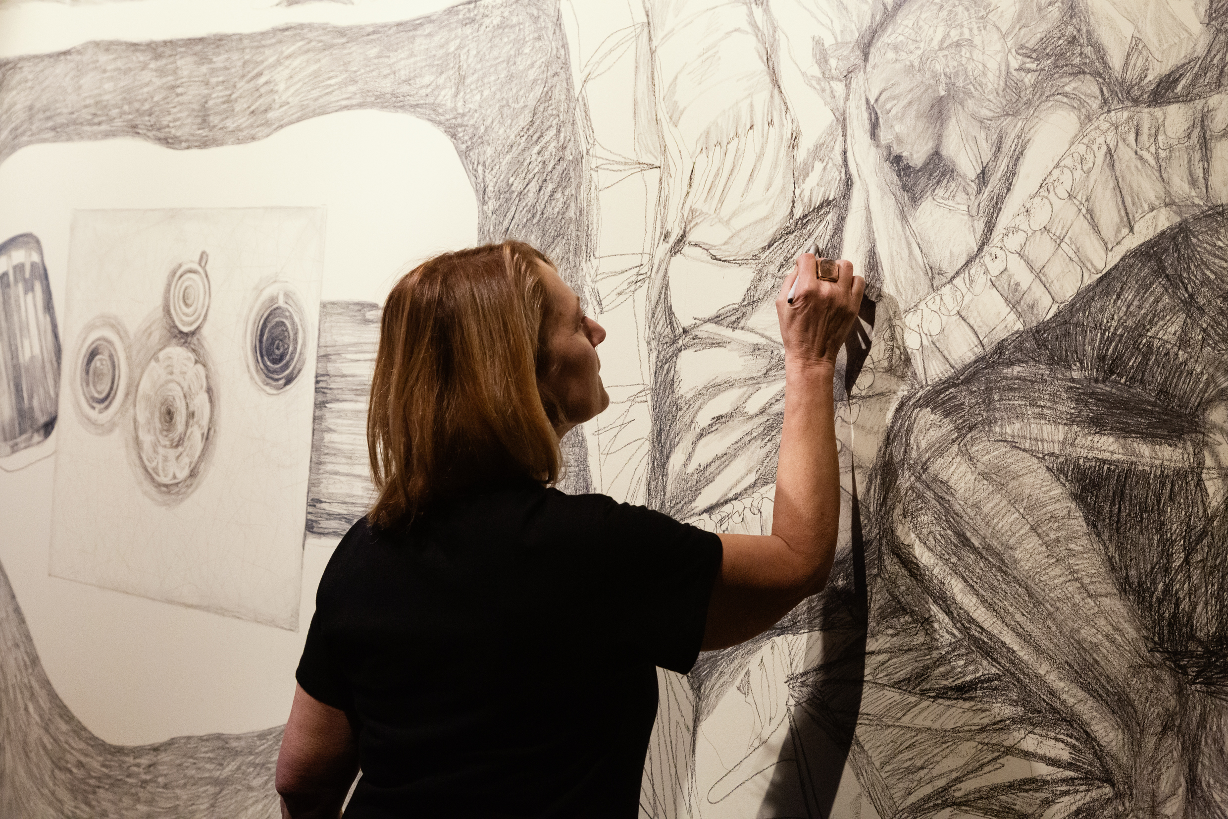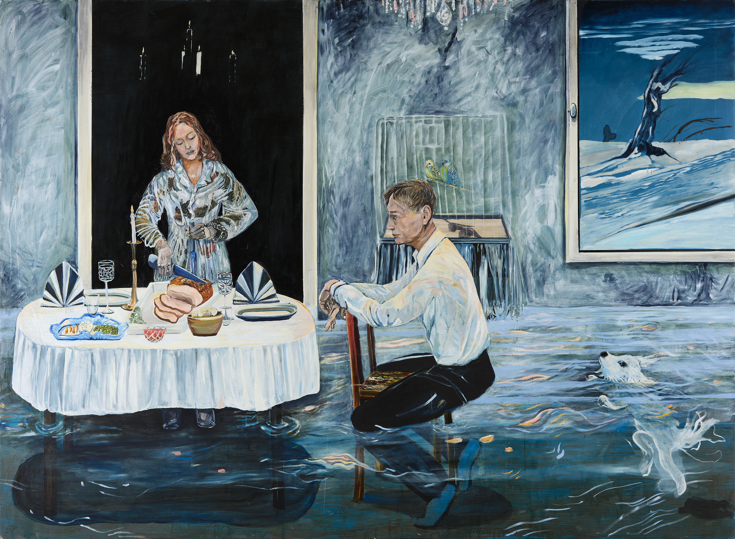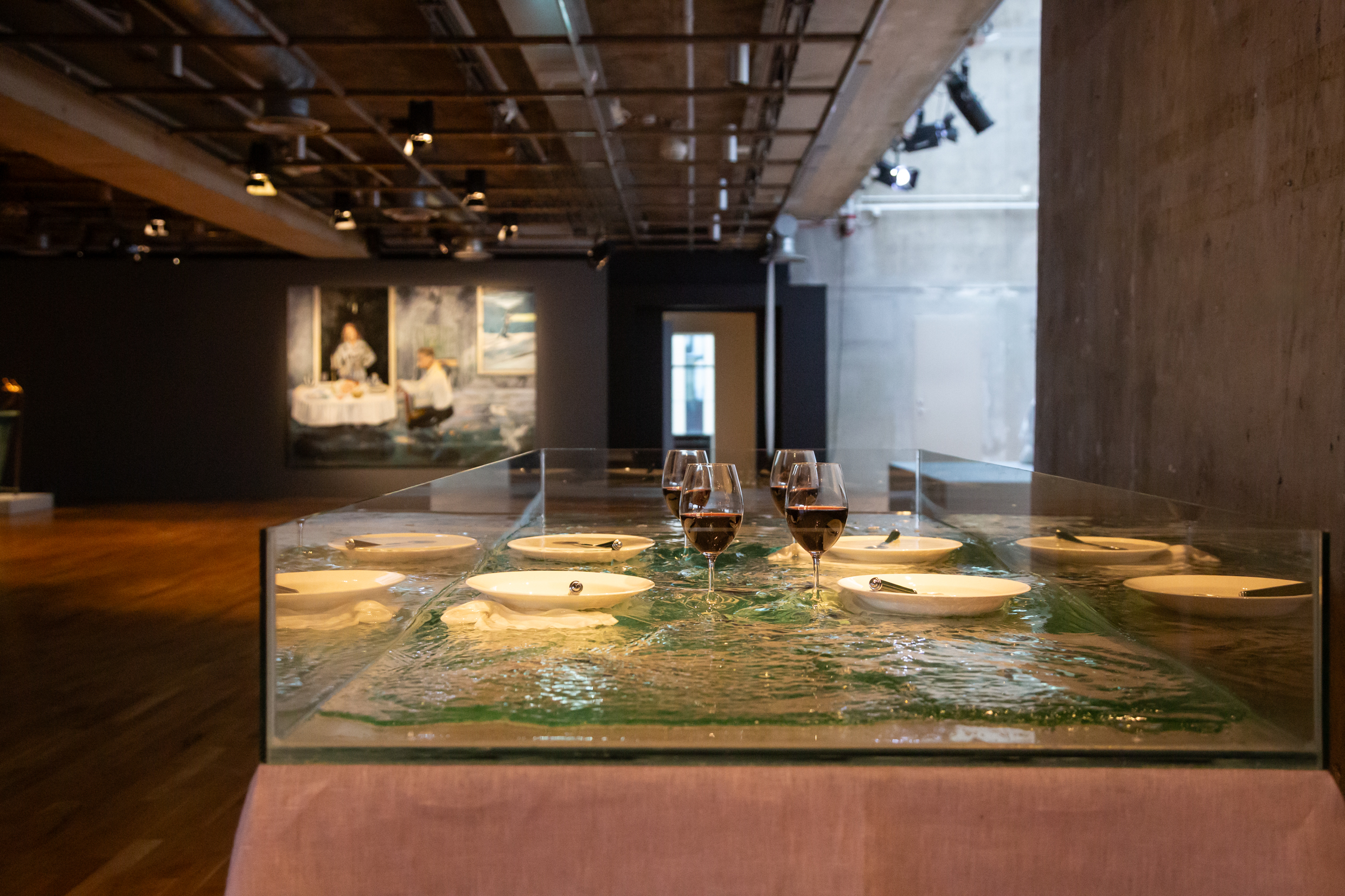 Centralt i utställningen står titelverket Festen som inte blev av – ett rum där ett dukat bord står kvar, urgröpt med håligheter där tallrikarna har sjunkit ner genom skivan. En rörelse har skett, men lämnat efter sig tystnad. Det är ett fruset ögonblick av något som aldrig riktigt hände.