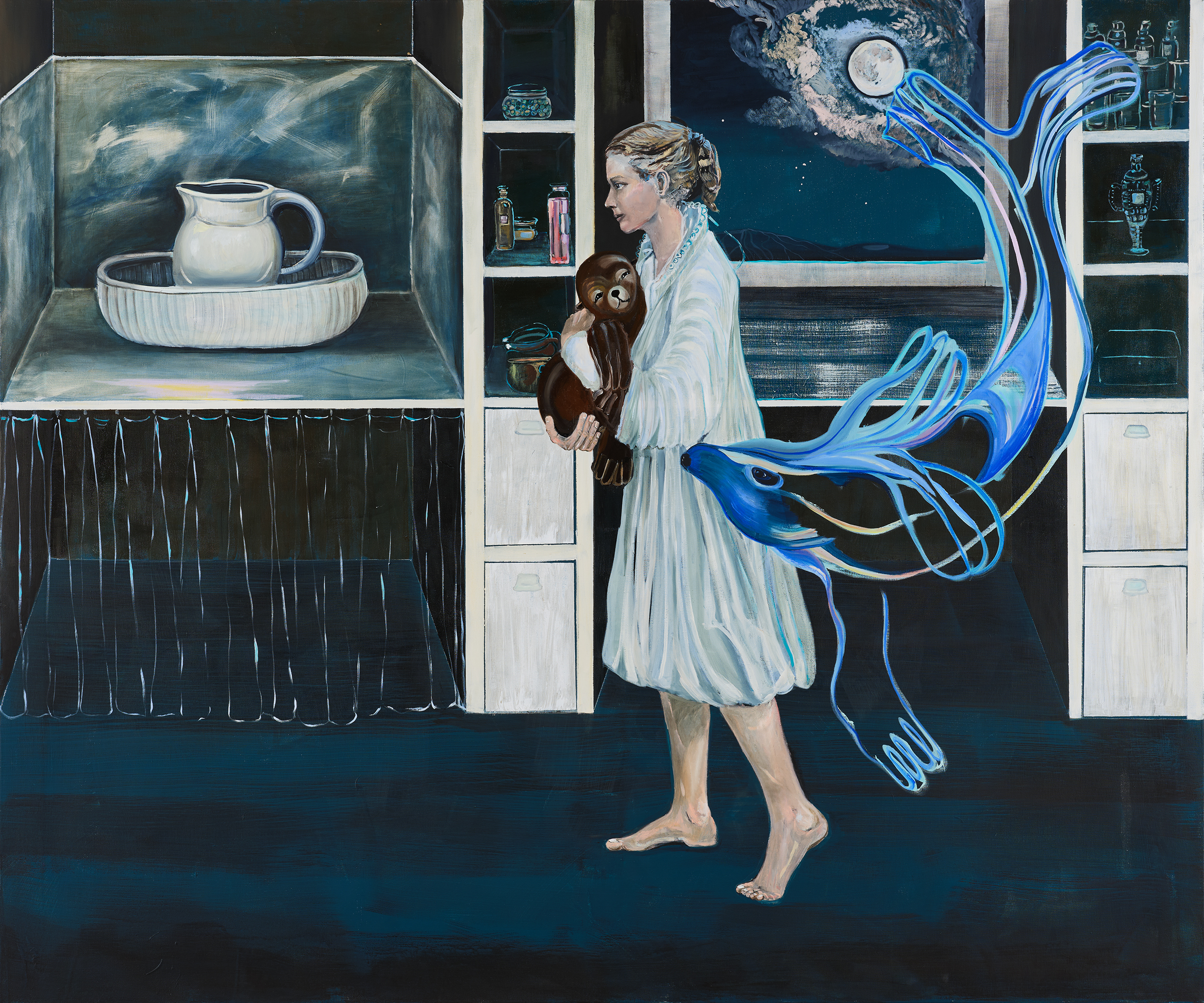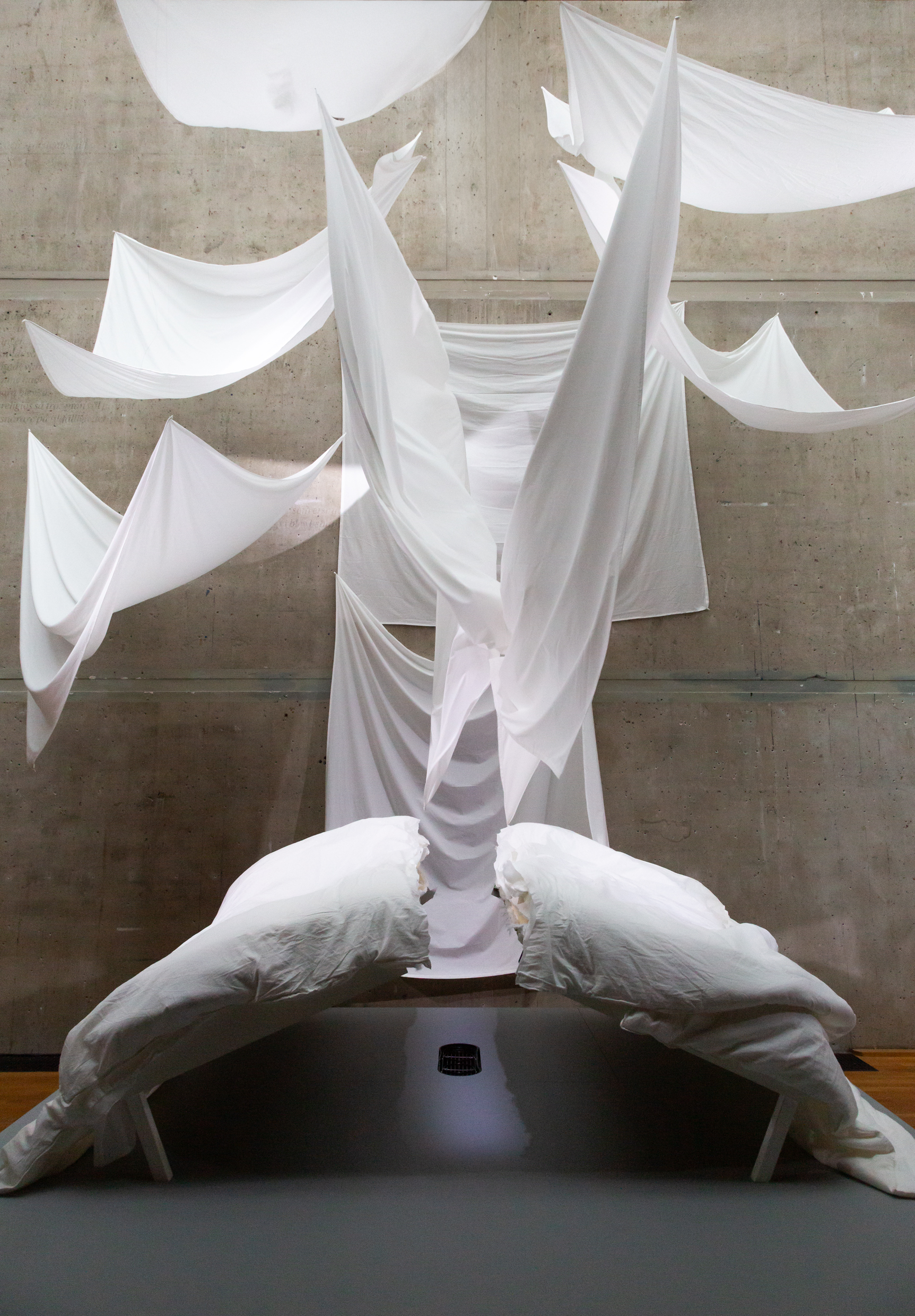 Meta Isæus-Berlins nya utställning är en fysisk och mental labyrint där betraktaren rör sig genom olika miljöer; en vagga i vatten, ett urgröpt middagsbord, en snurrande käftsmäll av metall, ett svävande kök, ett bassängrum med vattenytor och keramiktallrikar och ett sovrum i kris. Verken är kroppsliga, poetiska och symboliska – men aldrig privata. I stället söker Isæus-Berlin det allmängiltiga och igenkännbara, där varje besökare skulle kunna känna: det här handlar om mig.