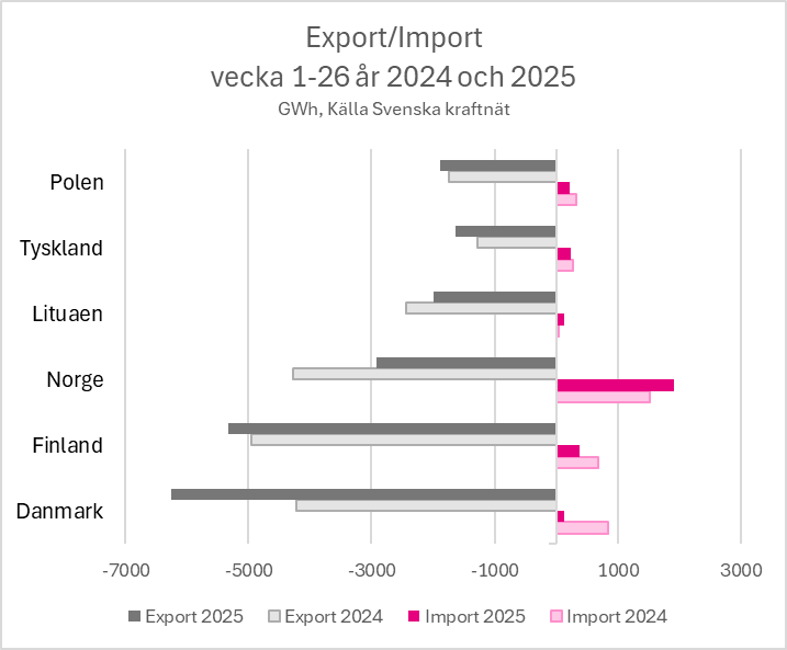 En mild vinter och god tillgång till vind- och vattenkraft har bidragit till ökad export av el. Tillsammans med minskad import har detta lett till en nettoexport på knappt 17 TWh – en ökning med elva procent jämfört med förra året – vilket är i linje med de senaste årens höga nettoexport från Sverige.