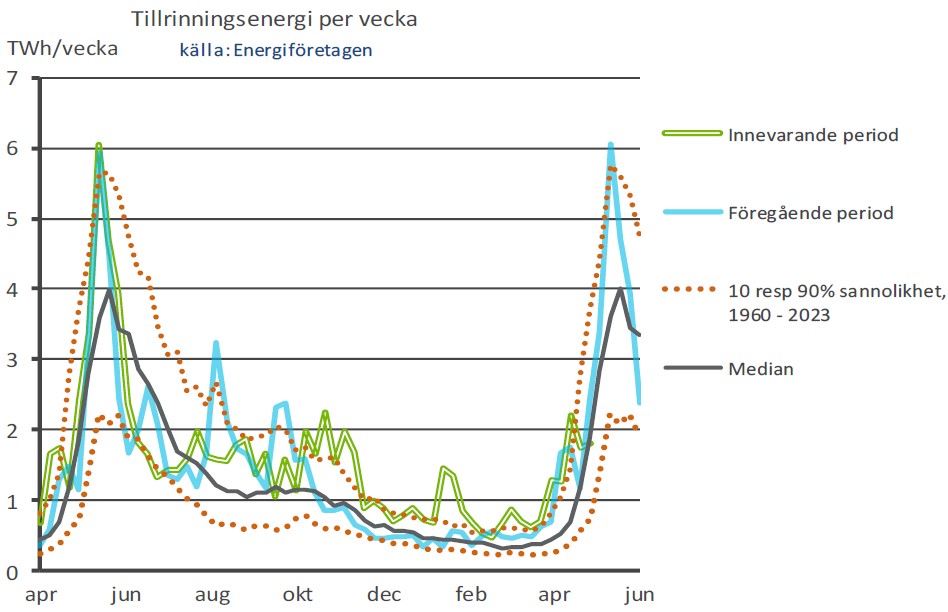 Vårfloden har en viktig funktion för energisystemet eftersom den fyller på vattenmagasinen med energi i form av lagrat vatten. Det är ungefär som att ladda ett batteri i stor skala för hela elsystemet. Tillrinningen över det senaste året jämfört med normalvärdena framgår av den första grafen nedan. Vi ser att den gröna kurvan börjat stiga på allvar från månadsskiftet mars/april. Detta är tidigt relativt historiken från år 1960 – både jämfört med medianen och den övre rödprickade kurvan, som bara överskridits av 10 procent av värdena historiskt.