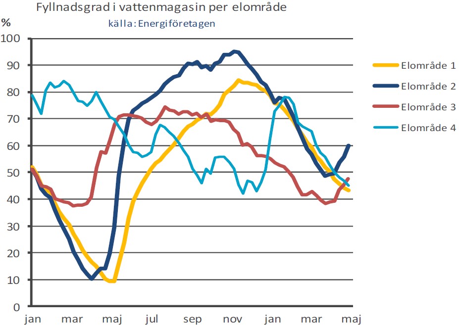 Vårfloden sker över en längre tid inom Sverige med start i de sydligaste delarna (se graf 2 nedan, med fyllnadsgraden över året i våra fyra elområden). Redan i januari toppade magasinen i vårt sydligaste elområde (elområde 4). Magasinen i elområde 3 och elområde 2 började vända uppåt i mars/april. När det gäller vårt nordligaste elområde 1 har magasinsnivån ännu inte vänt.