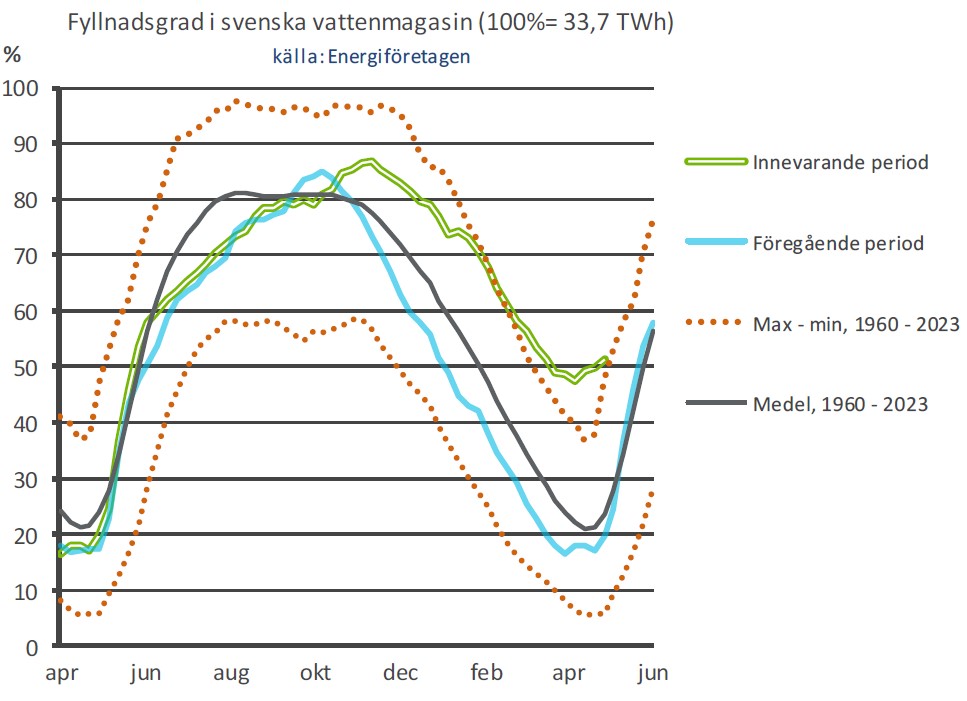 Det faktum att vi haft avsevärt högre tillrinningar under hösten och vintern har fått konsekvenser. Detta ledde till höga vattenmagasin i höstas som dessutom har fyllts på mer än normalt under vintern (det som ”normalt” skulle lagras som snö har kommit under vintern, det vill säga en del av vårfloden kan redan sägas ha kommit). Därför vänder magasinen på högre nivåer än normalt, vid 50 procents fyllnadsgrad mot normalt cirka 20 procent. Det innebär att vi i nuläget har cirka 10 TWh mer energi i magasinen än normalvärdet så här års. På nordisk nivå är det cirka 20 TWh mer än normalt för årstiden.