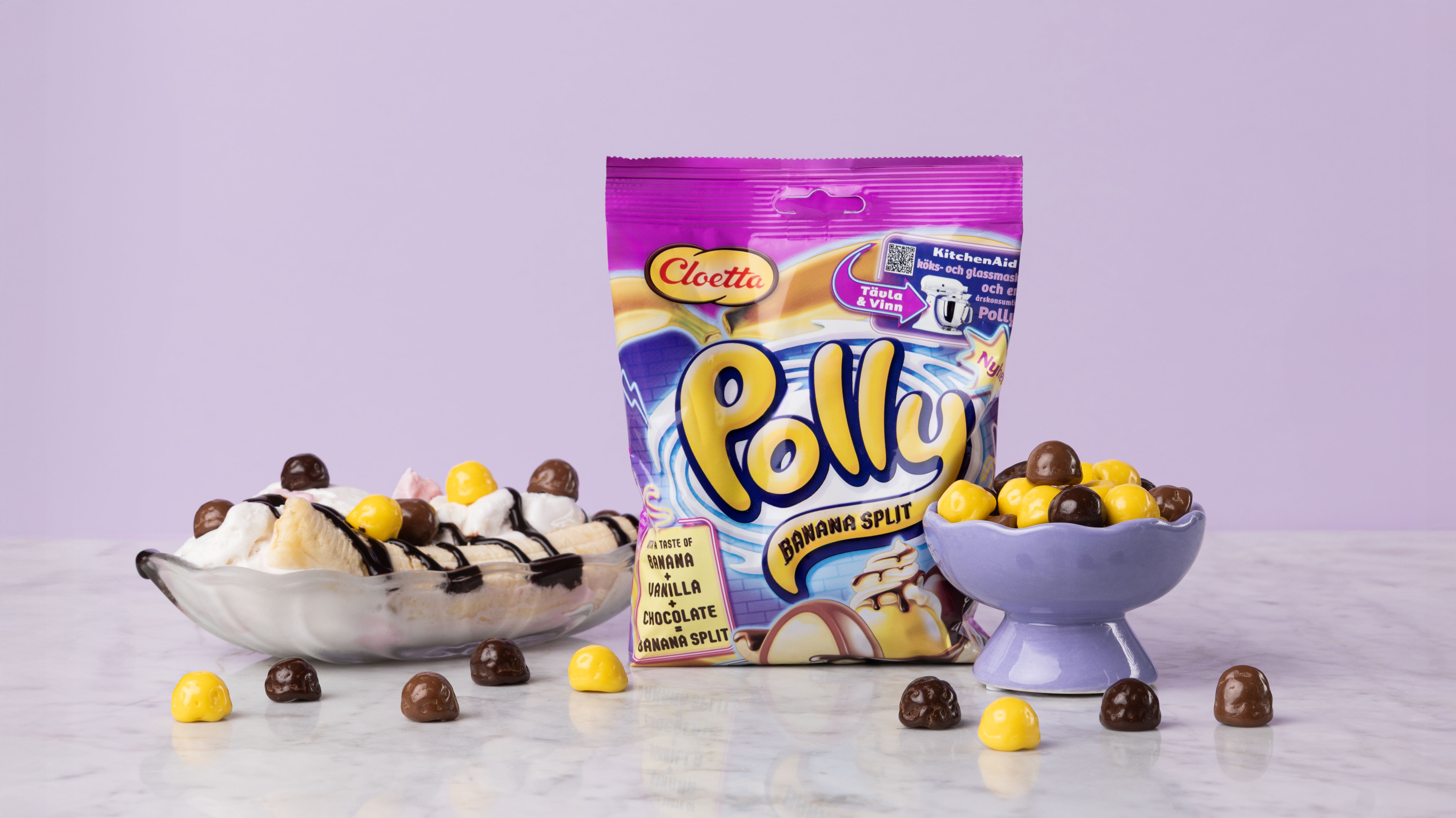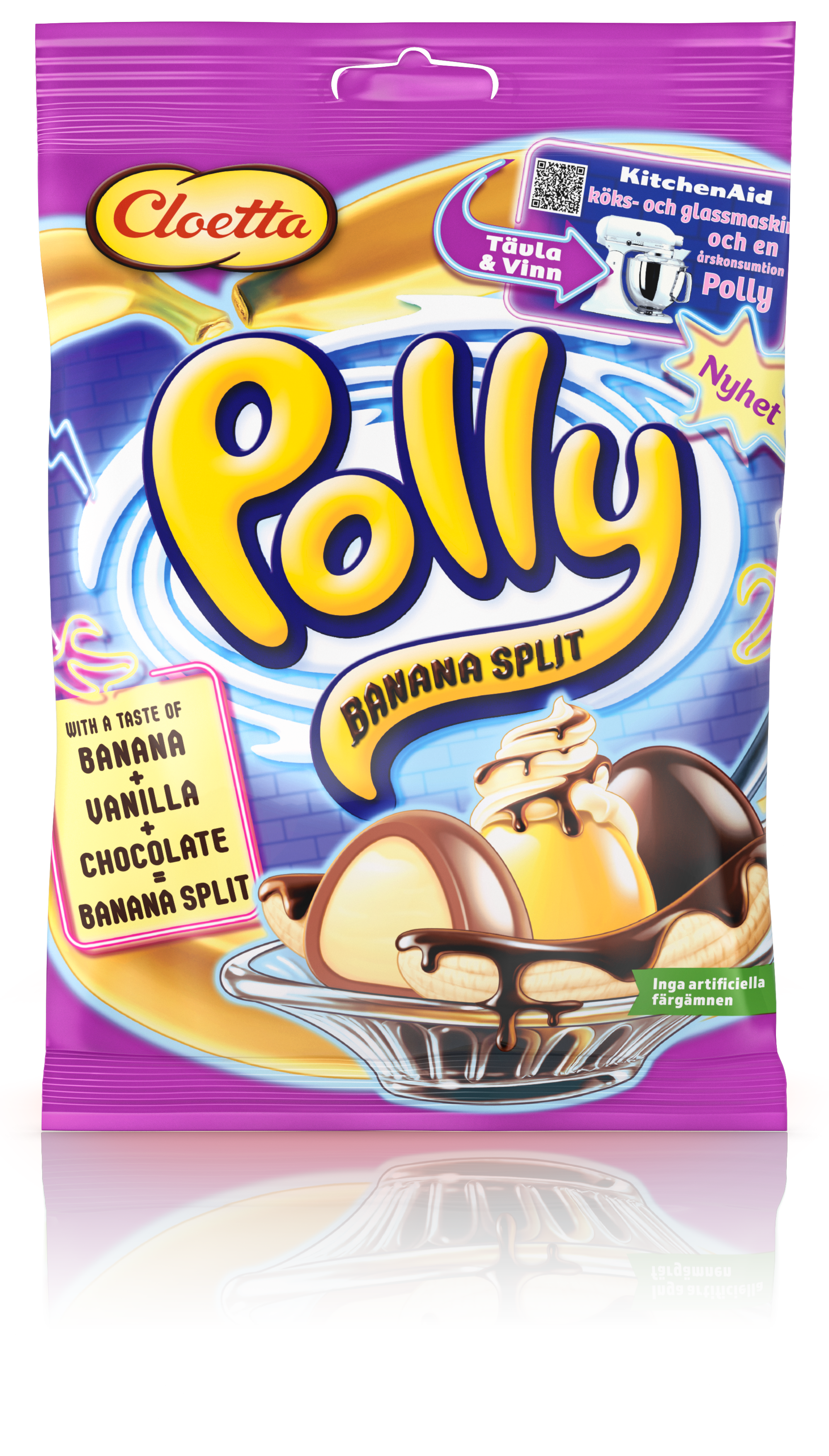 Polly kommer nu i en ny, oemotståndlig mix – men med samma härligt sega konsistens som tidigare. Genom att kombinera de olika dragerade komponenterna i påsen skapas smakbilden av den klassiska desserten Banana Split, med smakinslag av vanilj, banan och choklad.