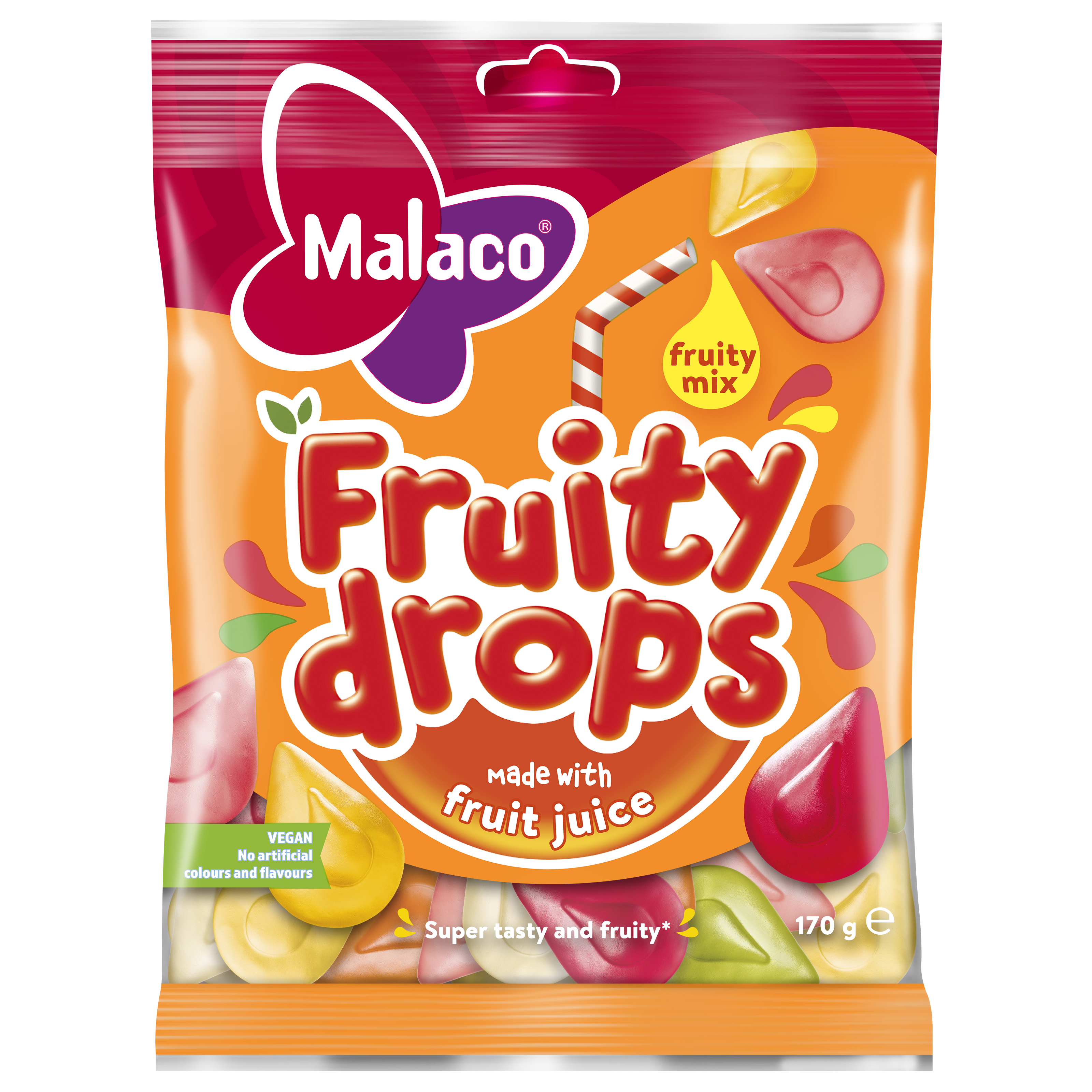 Malaco Fruity Drops är saftiga och smakrika godisbitar med mjuk och härlig textur. Fruity Drops kommer i två olika mixpåsar, Fruity Mix med smak av bland annat päron, citron, hallon och persika, och Fruit-licorice som kombinerar smaker som ananas, apelsin och jordgubb med lakritssmak.