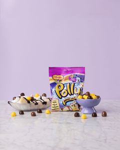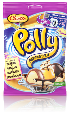 Polly kommer nu i en ny, oemotståndlig mix – men med samma härligt sega konsistens som tidigare. Genom att kombinera de olika dragerade komponenterna i påsen skapas smakbilden av den klassiska desserten Banana Split, med smakinslag av vanilj, banan och choklad.