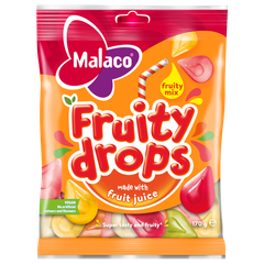 Malaco Fruity Drops är saftiga och smakrika godisbitar med mjuk och härlig textur. Fruity Drops kommer i två olika mixpåsar, Fruity Mix med smak av bland annat päron, citron, hallon och persika, och Fruit-licorice som kombinerar smaker som ananas, apelsin och jordgubb med lakritssmak.