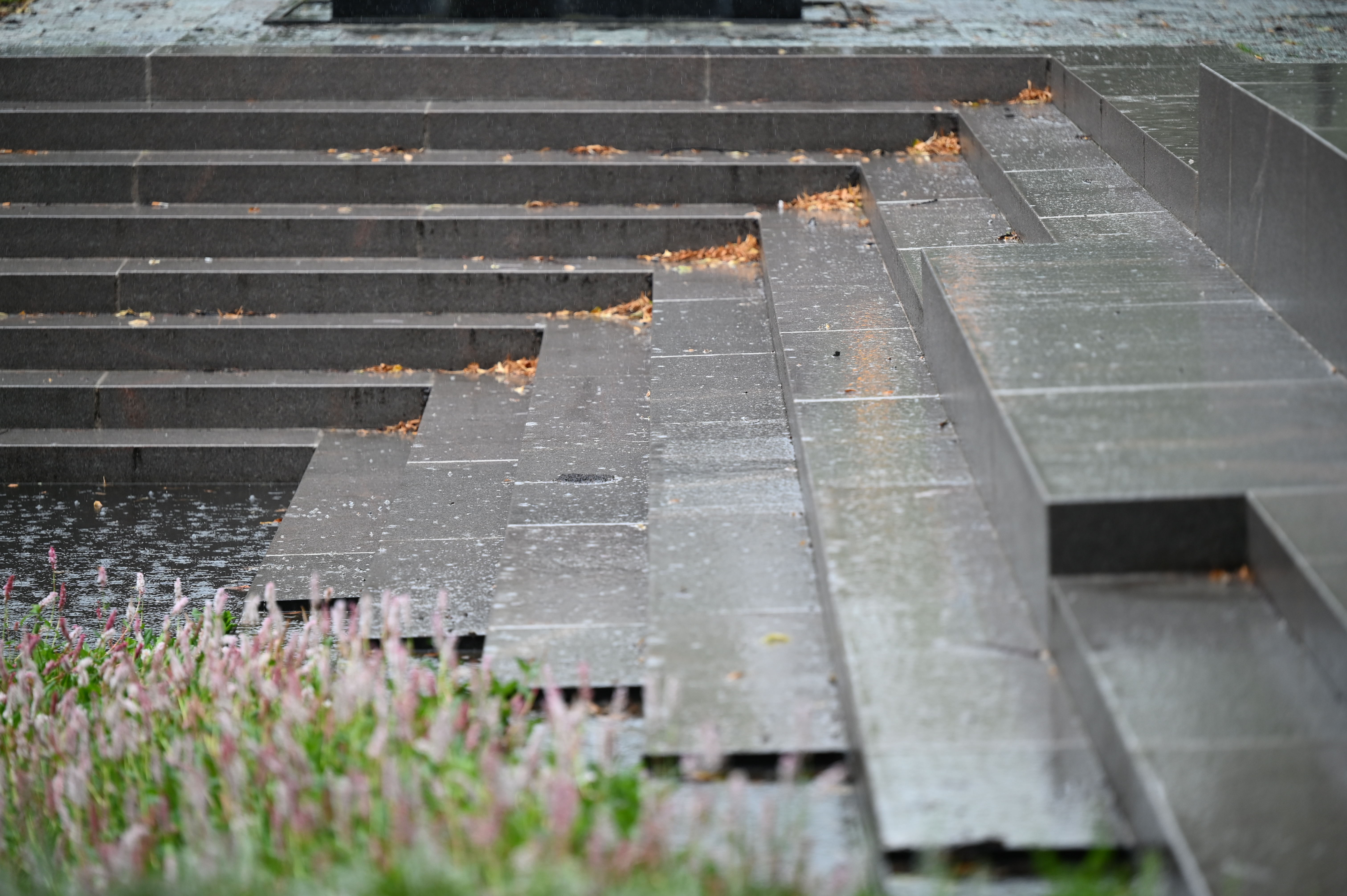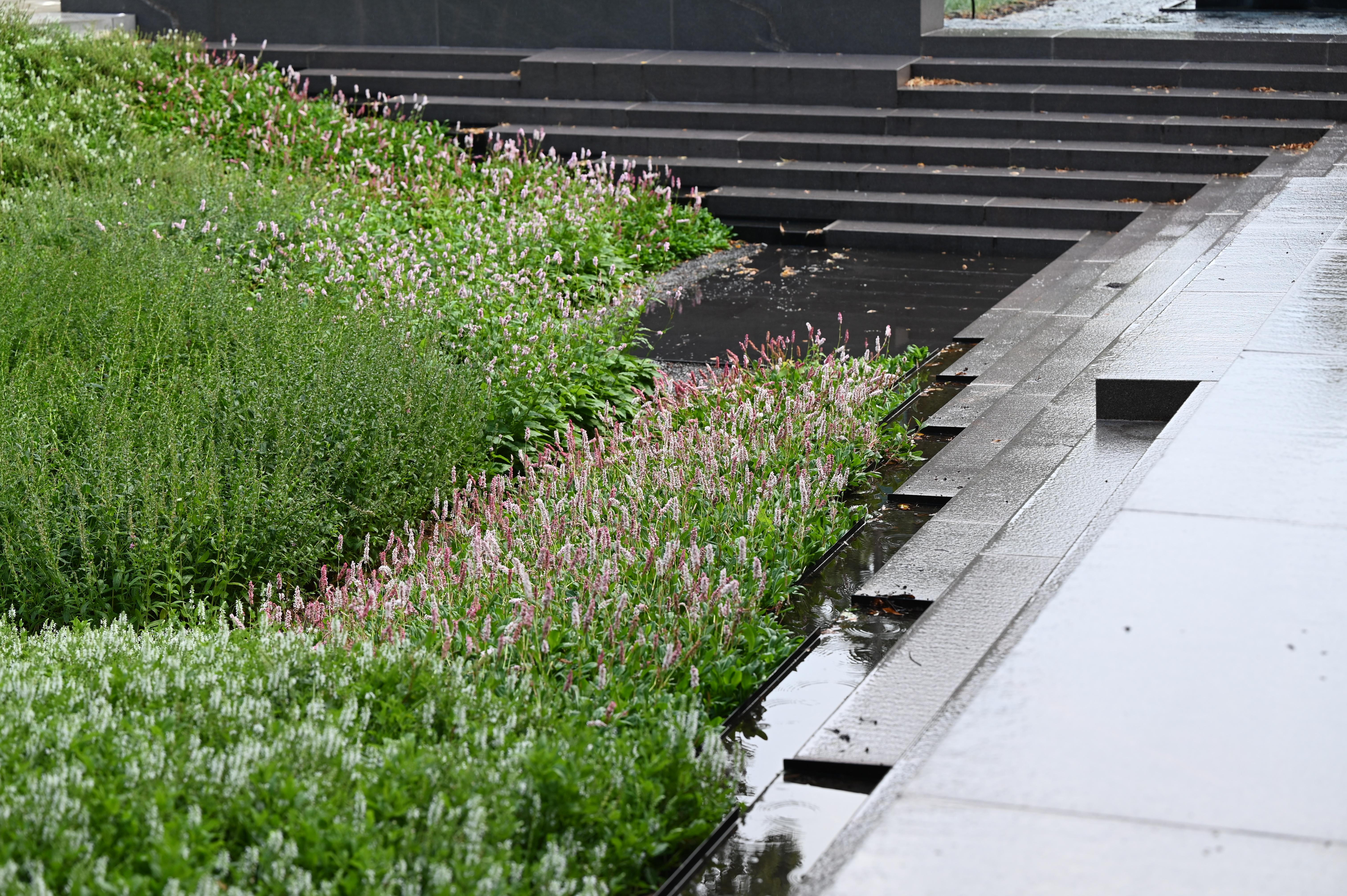 En trappa i vinkel leder ner i sänkan i parken där det växer blommor.