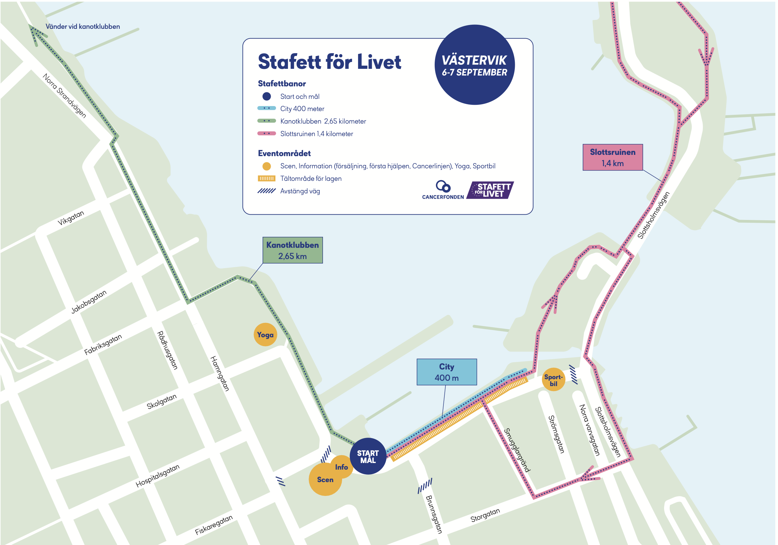- Öppningsceremoni: Stafetten invigs kl 11:50 lör den 6 september. Cancerdrabbade går första varvet påhejade och stöttade av publik och alla andra deltagare.