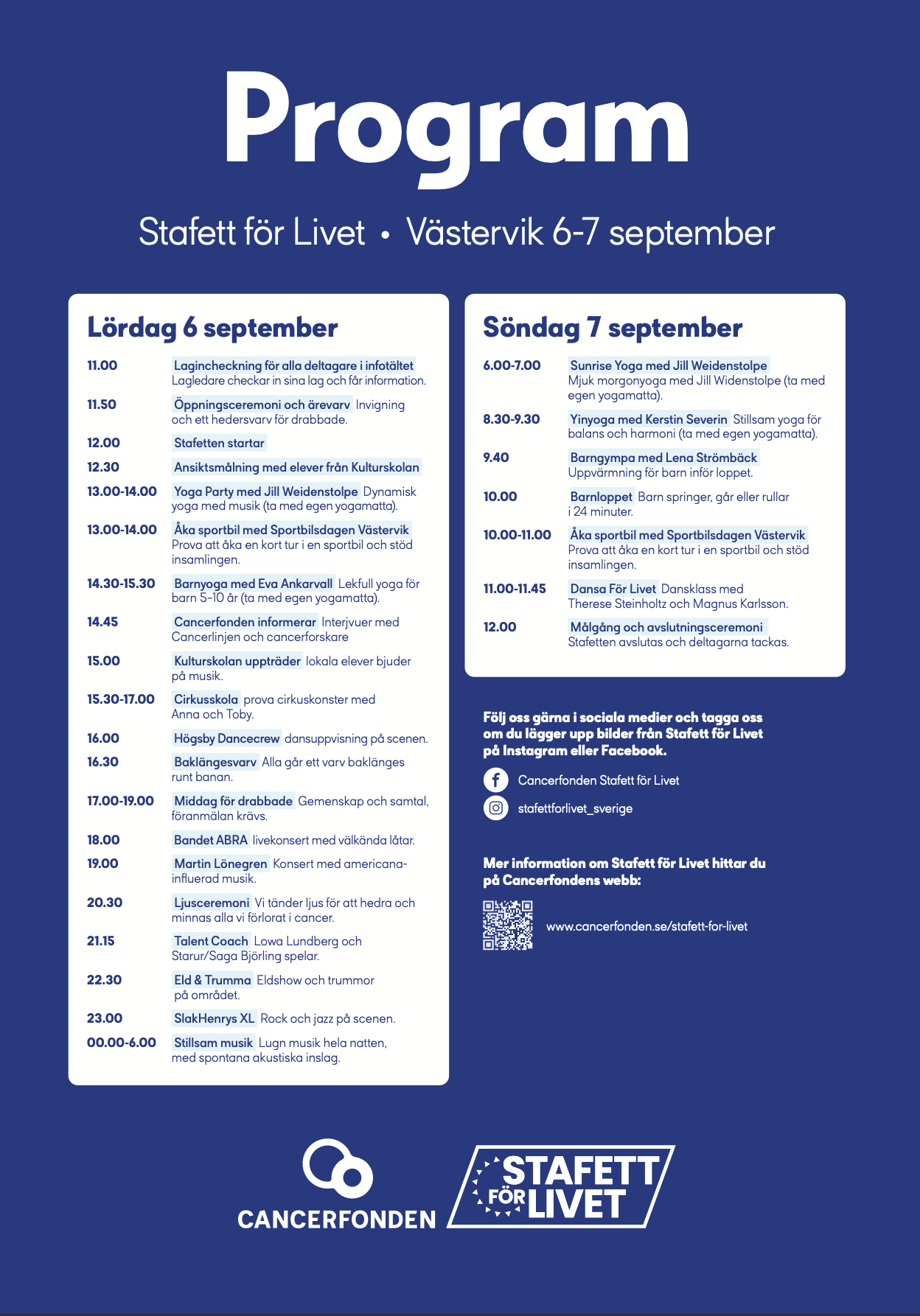 - Ljusceremoni: På lördagskvällen kl 20:30 tänds ljuslyktor för att hedra och minnas dem som gått bort i cancer.