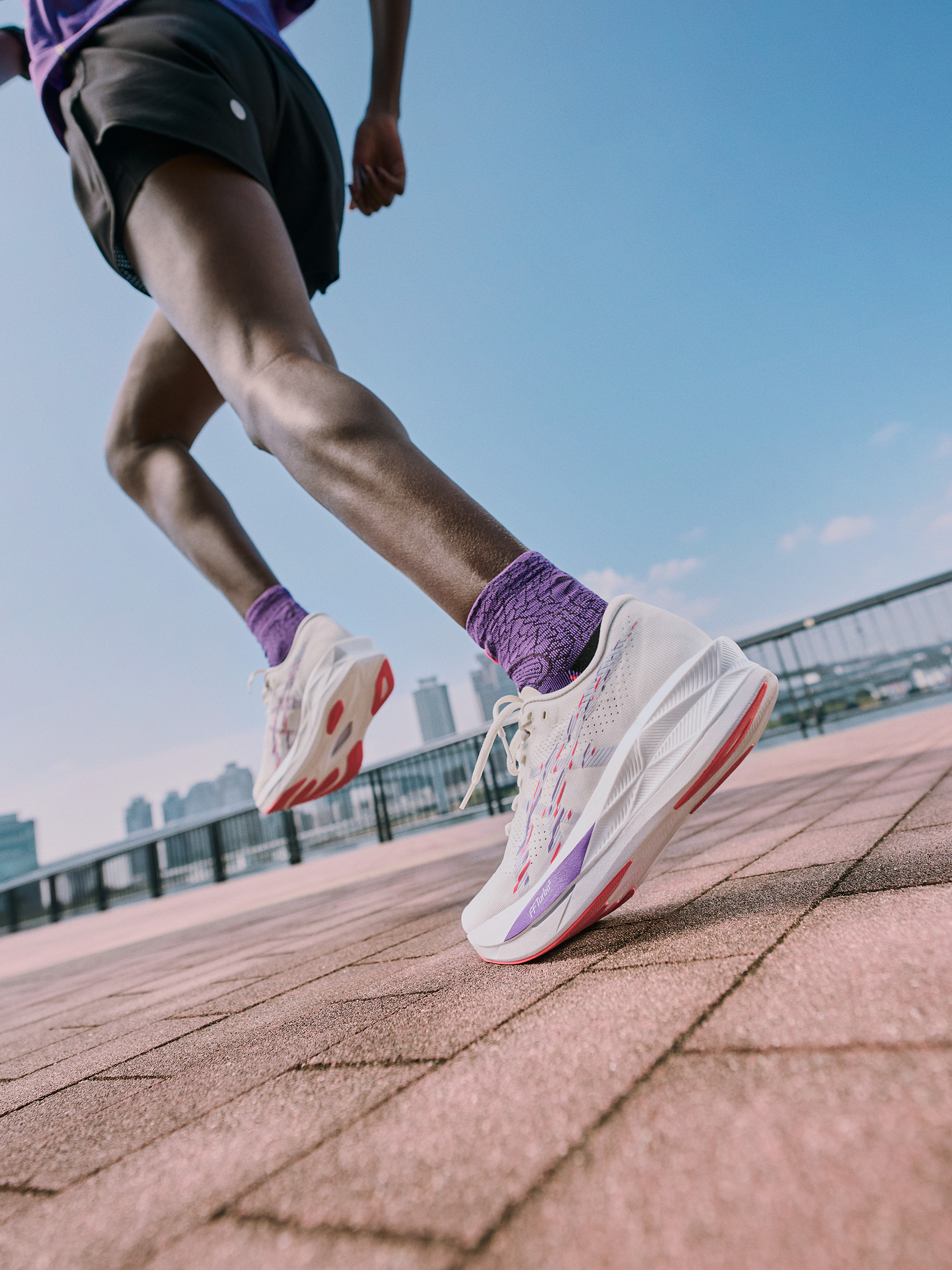 Modellen SONICBLAST™ är lika responsiv men har ett mer specifikt fokus: att göra kortare och snabbare löprundor roligare, vare sig det handlar om träning eller tävling. Den kombinerar TURBO™ SQUARED skum med ett lager FF BLAST™ MAX, ett av ASICS lättaste och mest energigivande material som ger en mjuk, molnlik känsla under foten. Mellan dessa två lager sitter ASTROPLATE™, som hjälper löparen att få ett mer effektivt frånskjut och en snabbare och mer responsiv känsla.
