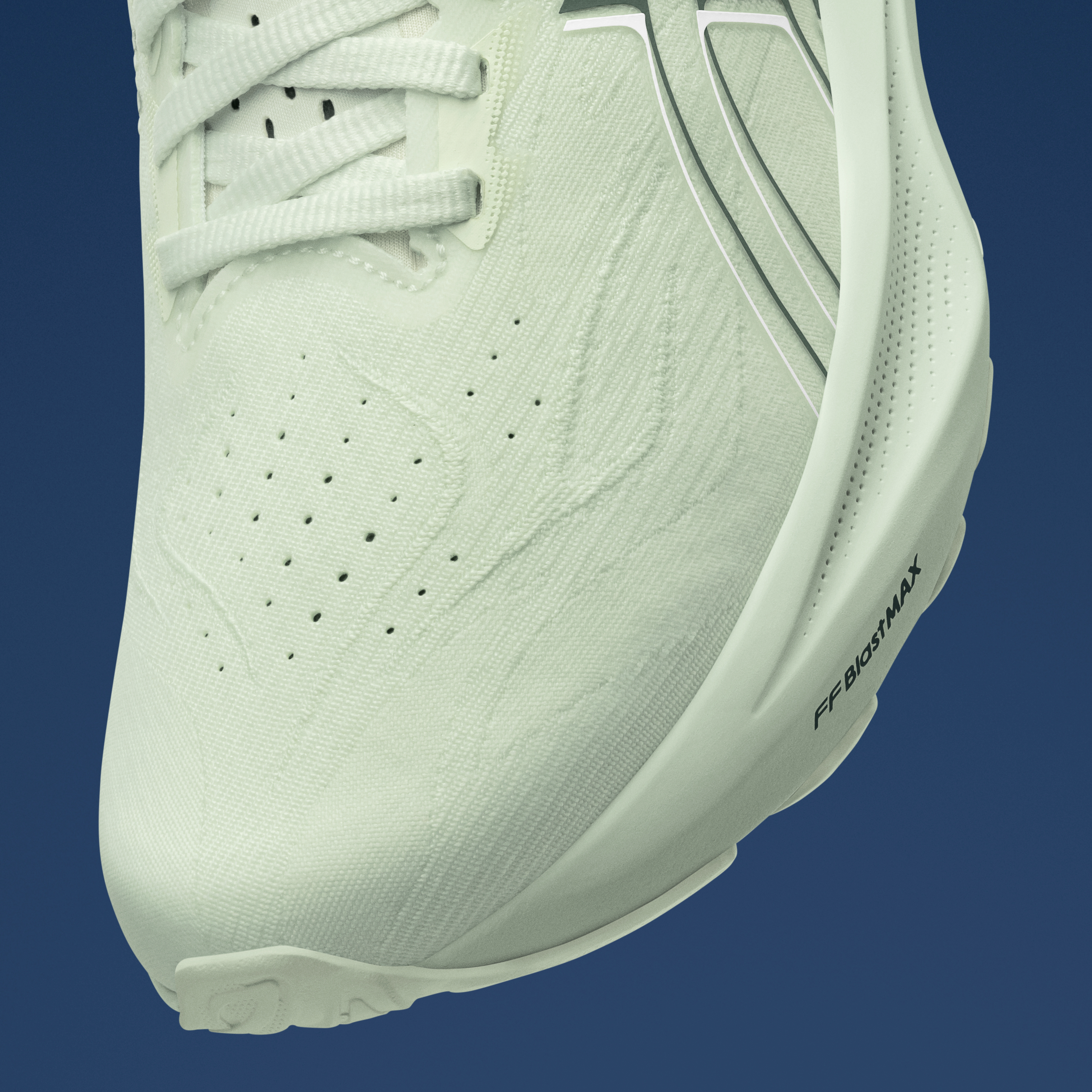 Forfoten har fått en ny trampoline-lignende pod-struktur inspirert av ASICS BLAST-serie, designet for å gi støtte og stabilitet samtidig som den skaper en spenstig følelse under foten. Sammen med FF BLAST™ MAX-dempingen forsterker denne konstruksjonen både respons og energi, noe som gjør løpeturene mer dynamiske og oppløftende.