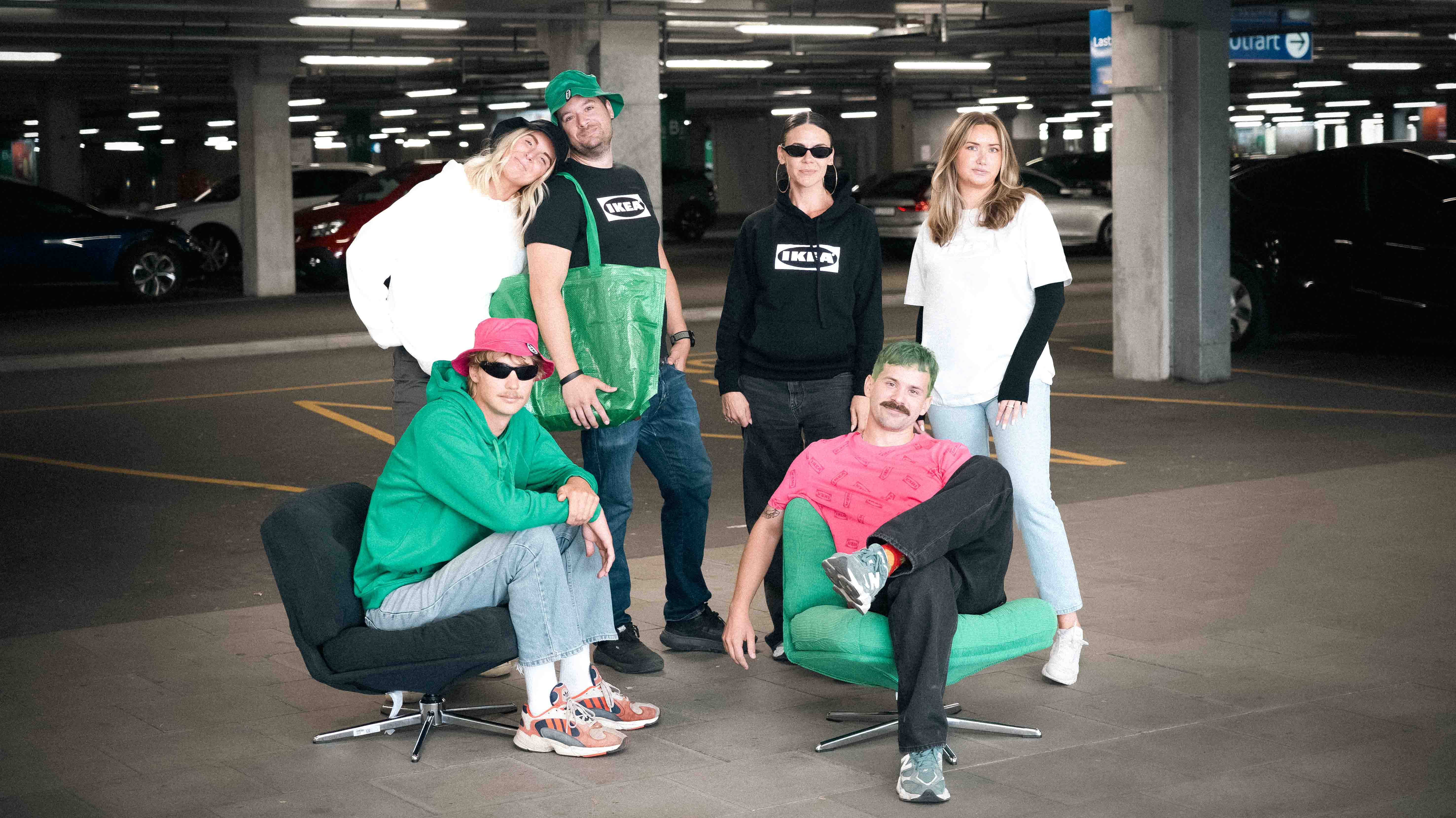 Sex personer befinner sig i ett parkeringsgarage. Fyra står och två sitter i fåtöljer. De har alla kläder på sig som visar IKEA-logotypen.