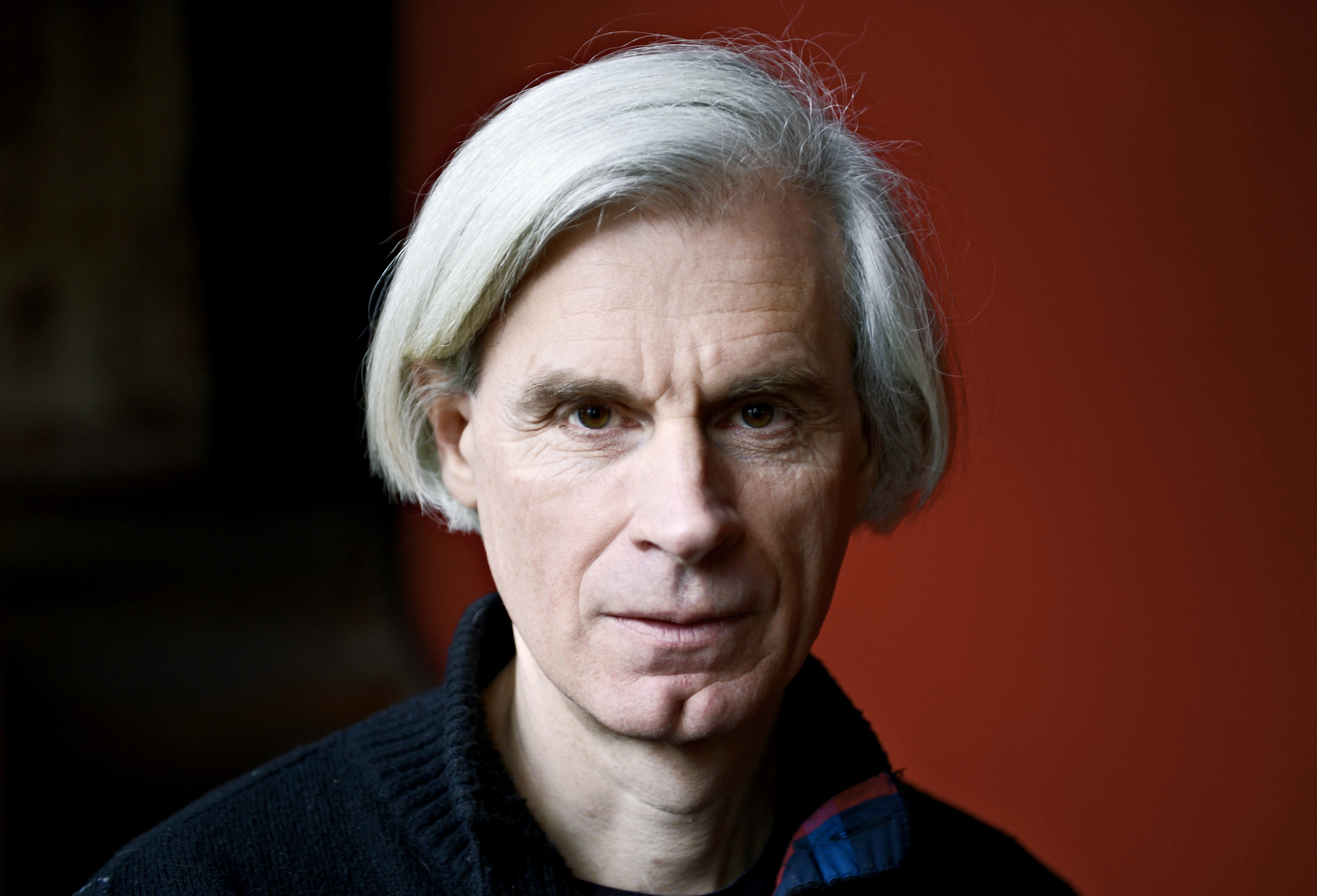 En äldre man i grått hår med seriös min. Röd bakgrund.