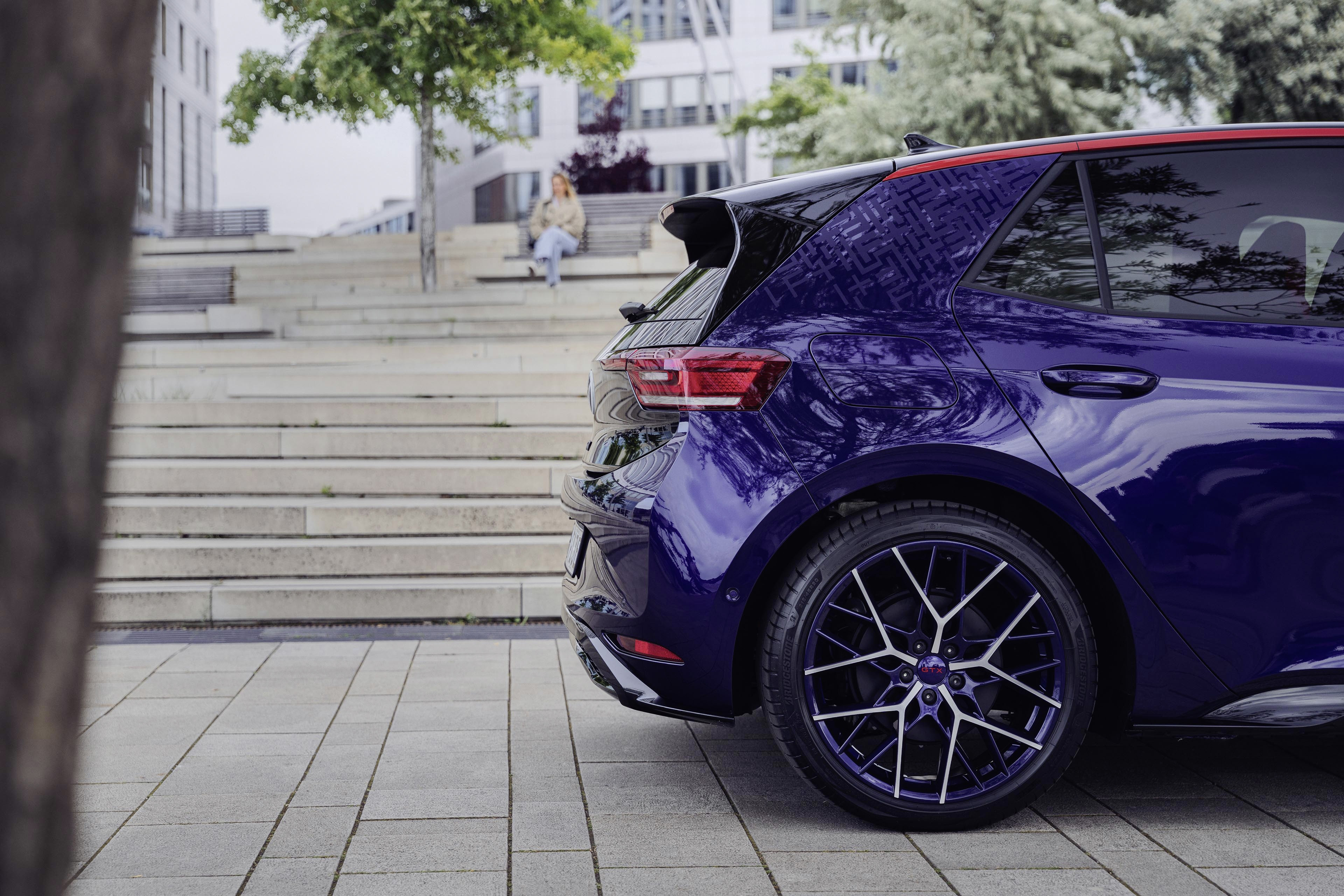 Det viktigaste som skiljer ut exteriören hos ID.3 GTX FIRE+ICE är lacken Ultra Violet Metallic. Den unika färgsättningen är en hyllning till den legendariska Golf-föregångaren som fanns i en liknande färg. Takramslisten ger också en sportig touch med sin kraftfulla röda eloxerade lack i Flaming Red. C-stolpen pryds av en transparent matt dekal med det geometriska mönstret FIRE+ICE. Dessutom pryds takspoilern av Fire and Ice-logotypen från 1990-talet.