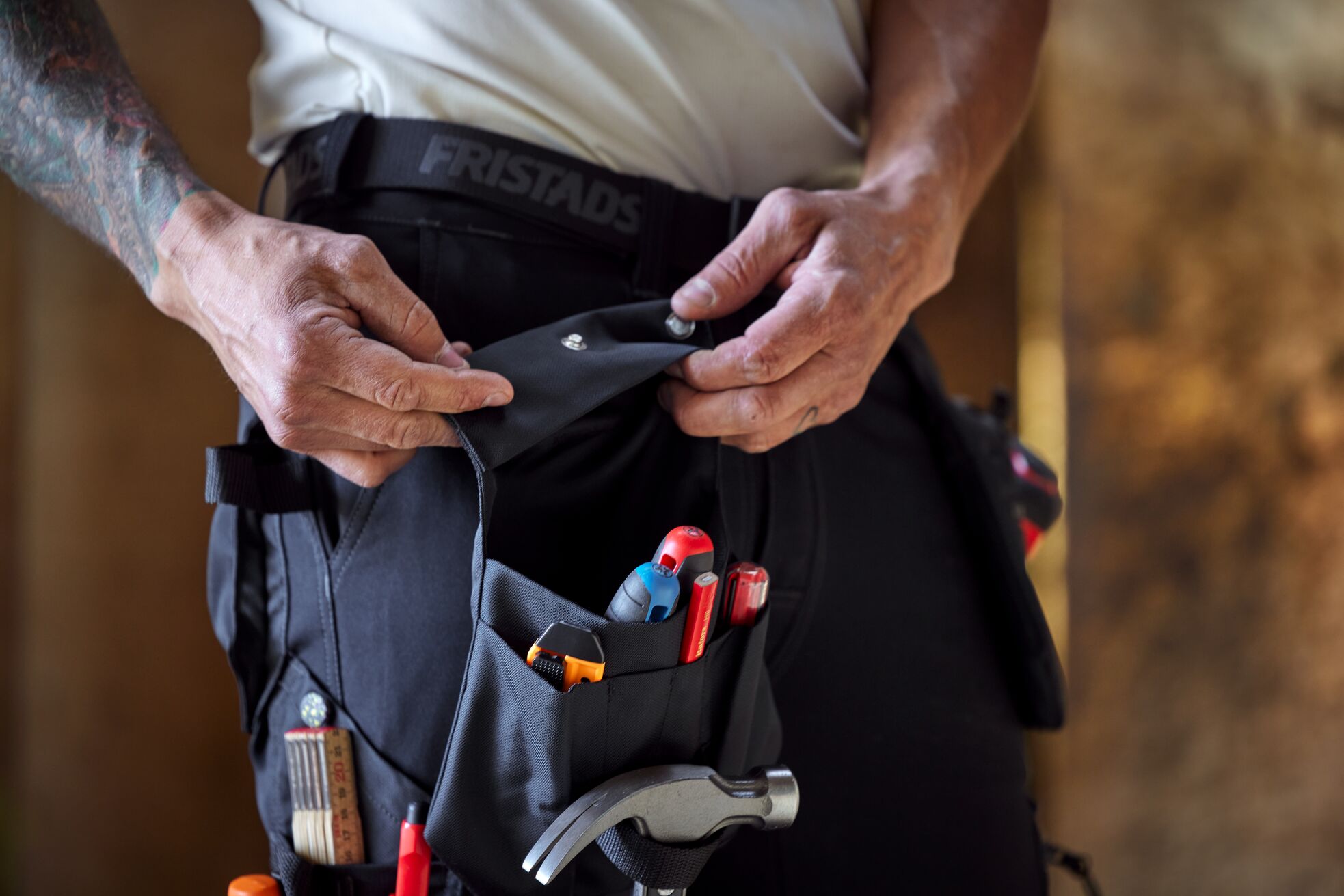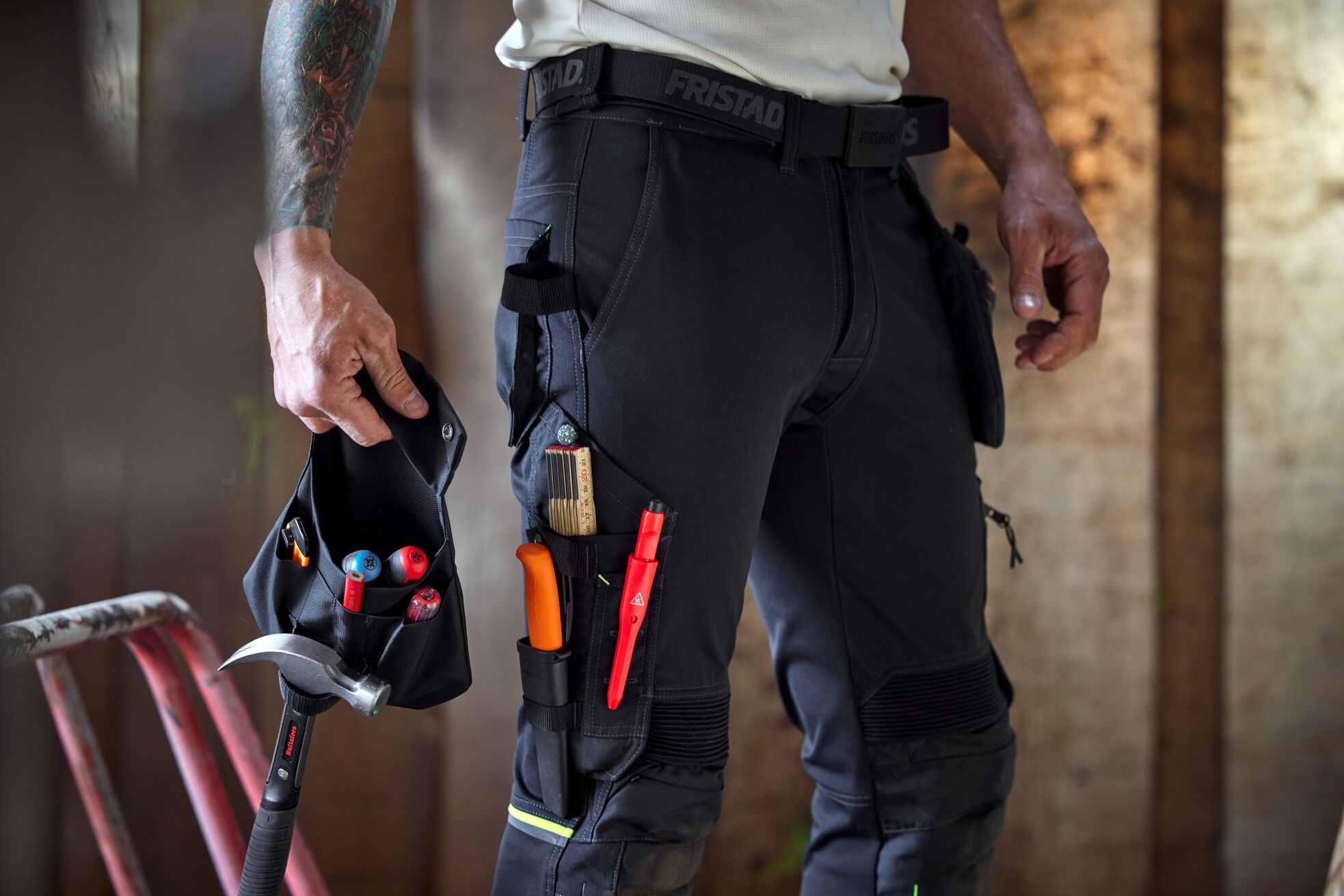 I över två år har Fristads utvecklat byxan tillsammans med yrkesproffs. Resultatet är en byxa som går att anpassa efter dagens jobb – med fickor som du kan sätta på när du behöver dem och ta av när du vill arbeta lättare. Fickorna fästs med starka magneter som är testade för att hålla upp till 20 kilo.