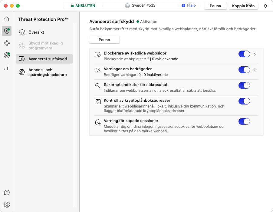 Den nya kontrollfunktionen i Threat Protection Pro™ identifierar och varnar för potentiellt farliga kryptoplånboksadresser under webbsurfning.