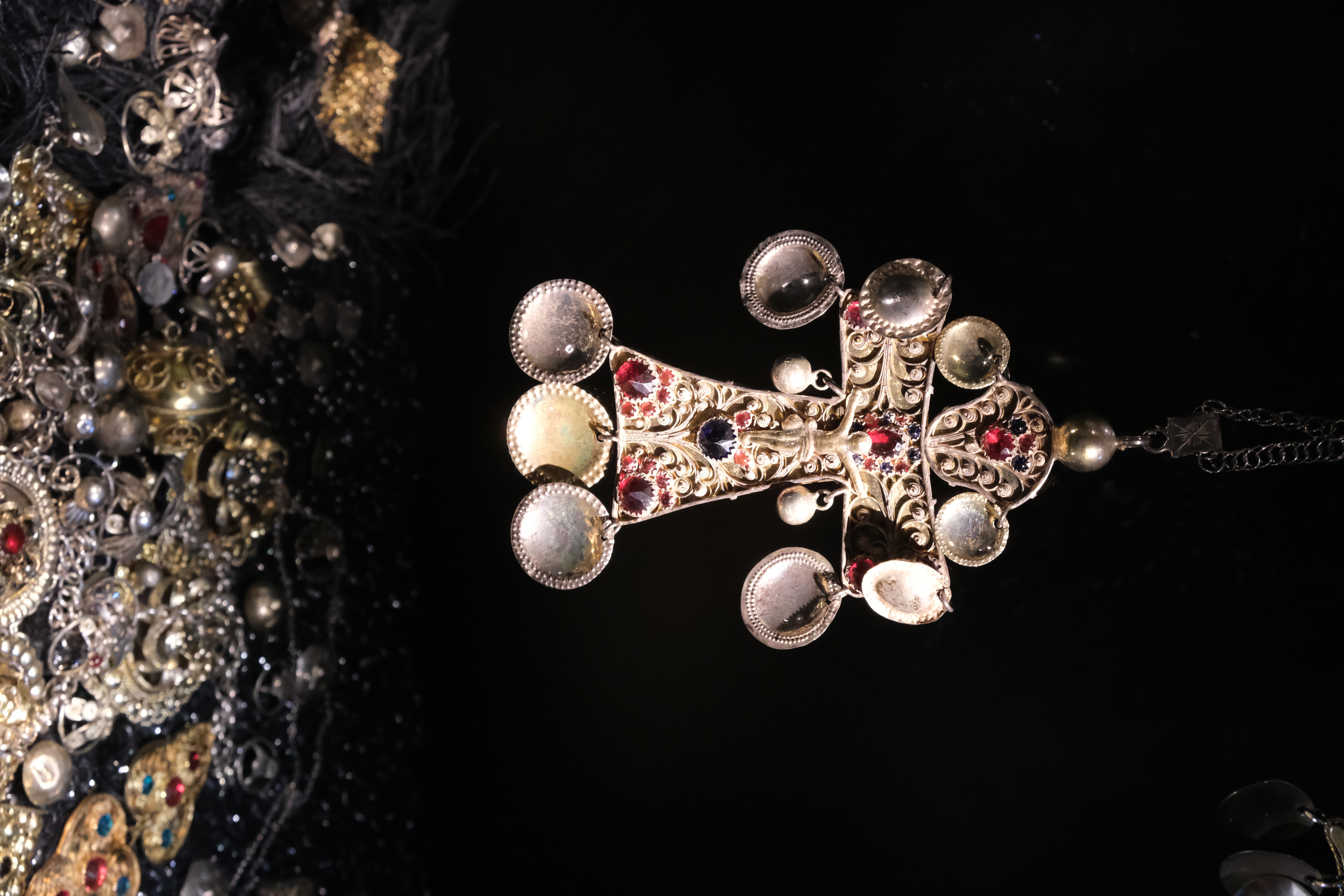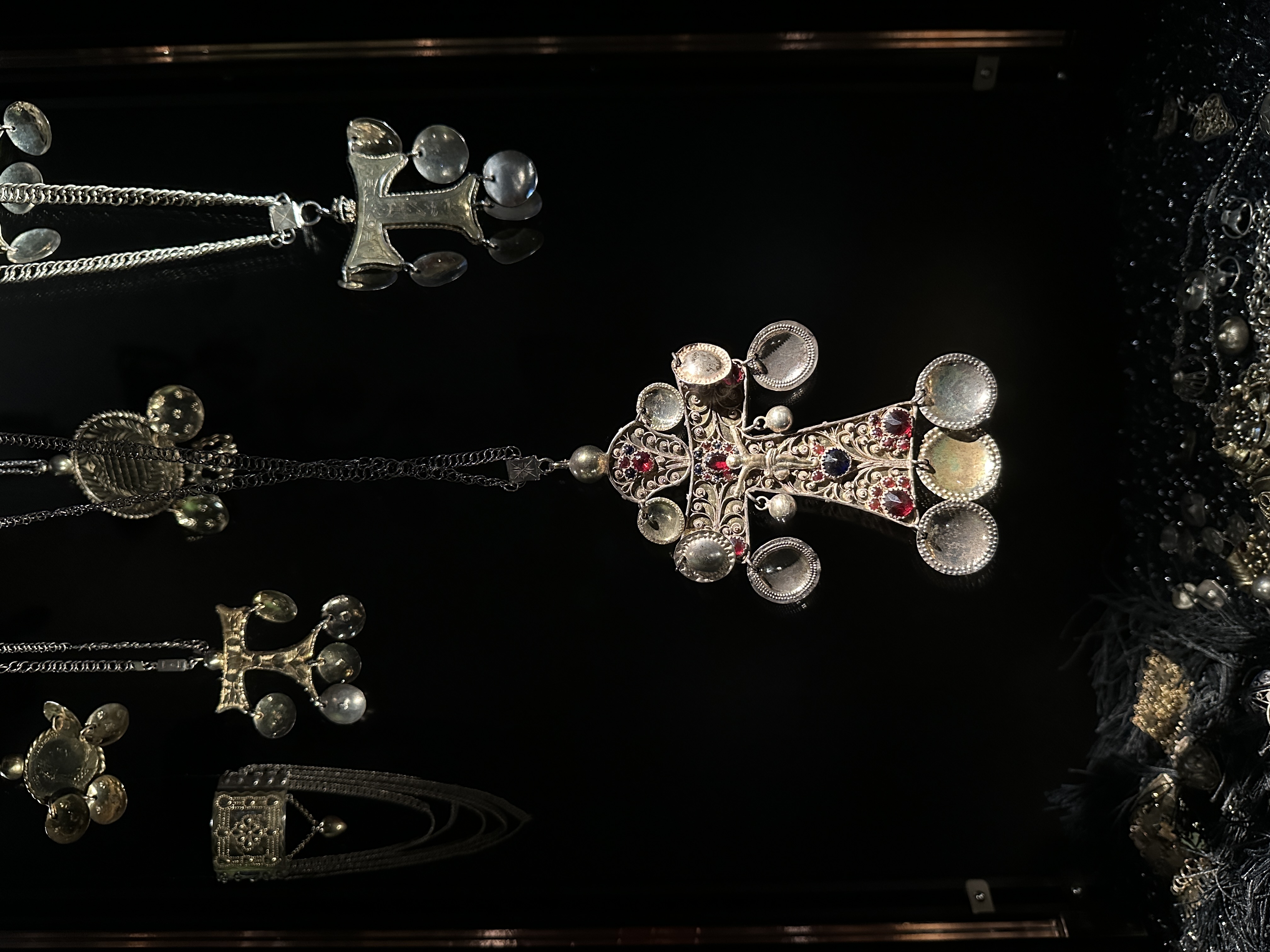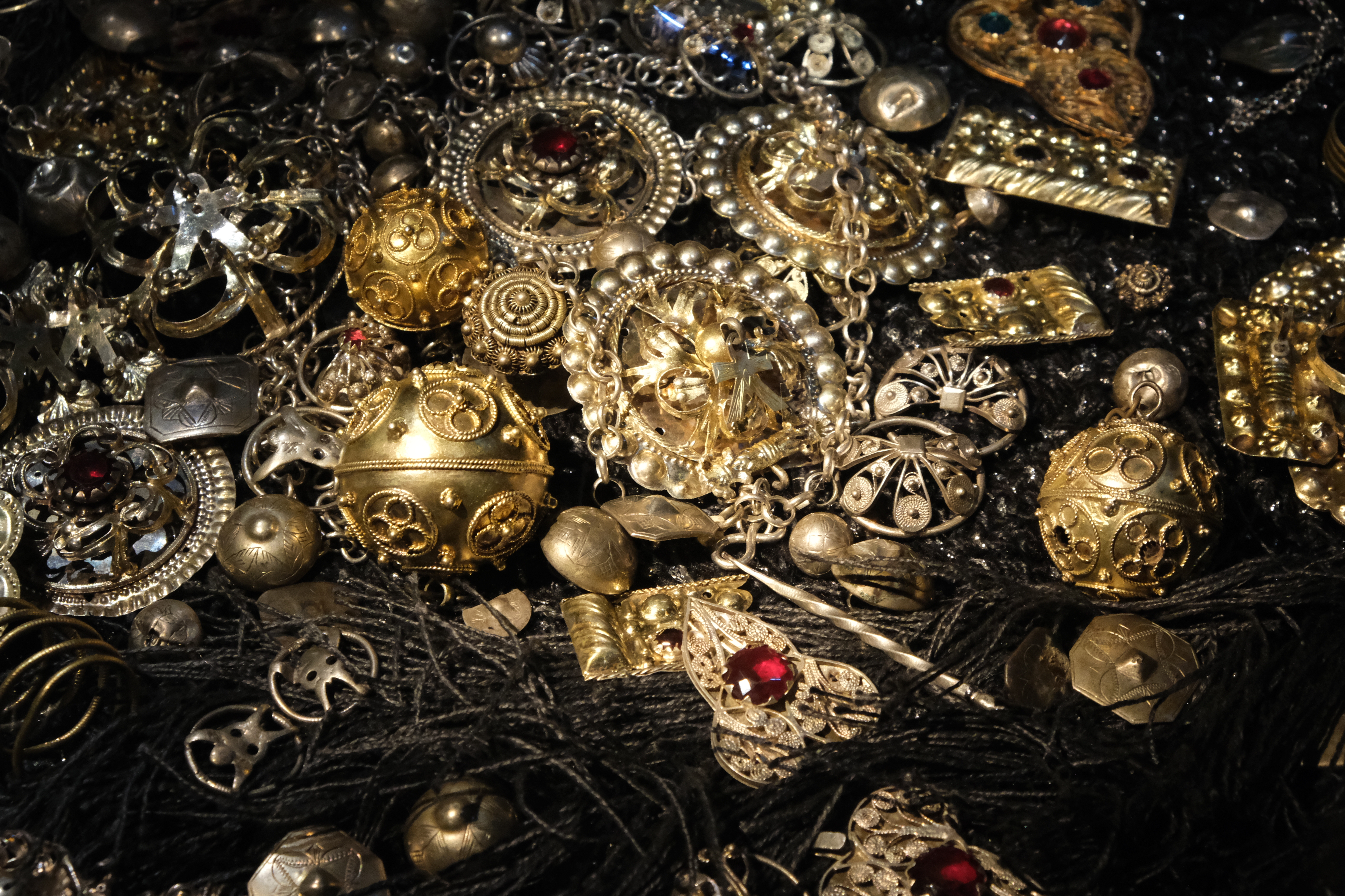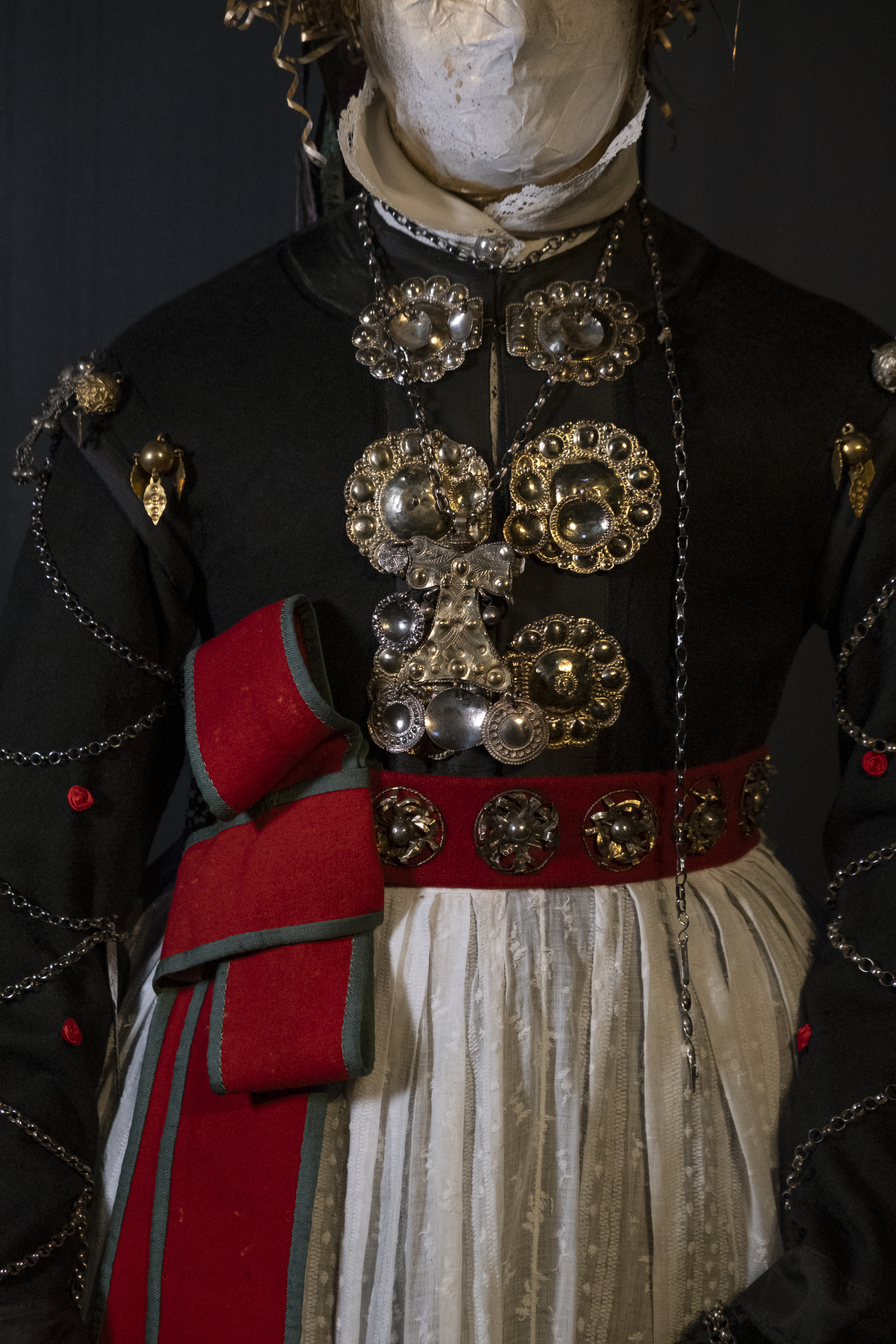 Dräktsilver är ett nytt glimrande inslag i utställningen. Det bars främst vid stora fester och högtider, och var tydliga statusföremål – ju mer desto bättre! Vissa typer av smycken var enbart dekorativa medan andra också hade en praktisk funktion.