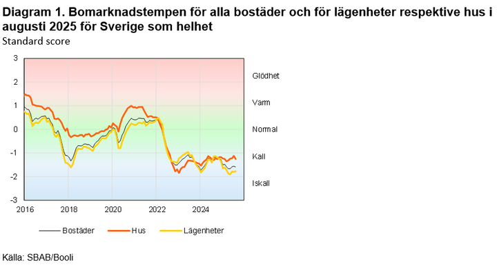 Temperaturen på den svenska bostadsmarknaden som helhet (lägenheter och hus sammantaget i hela Sverige) sjönk något i augusti (se diagram 1).