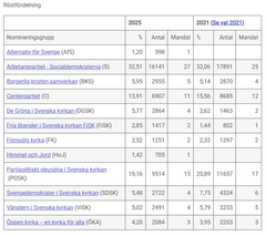 | Fria liberaler i Svenska kyrkan (FiSK) | 2,85 | 1417 | 2 | 1,44 | 802 | 1 |