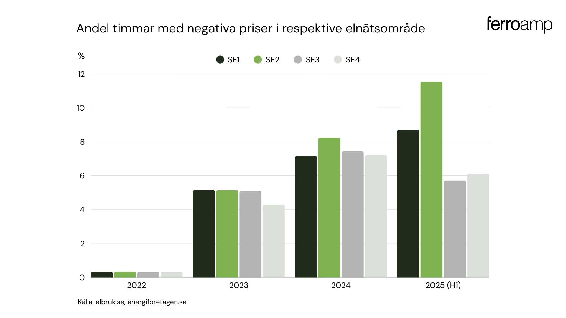 Under de senaste åren har negativa priser blivit allt vanligare i elnätet. Det uppstår när elproduktionen är hög samtidigt som efterfrågan är låg. Det innebär att elproducenter måste betala för el de levererar ut på elnätet. I norra Sverige var priserna negativa cirka tio procent av tiden under första halvåret 2025. I söder var motsvarande siffra sex procent.