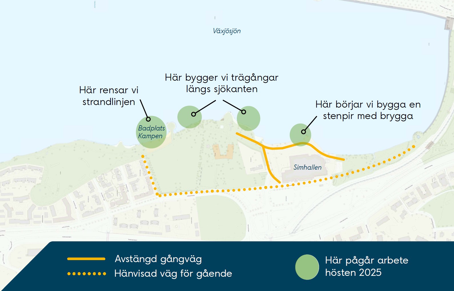 Under byggtiden stängs gångvägen mellan simhallen och sjön. Gående hänvisas i stället till Kampastigen. Befintliga aktivitetsytor vid Kampen och sjön som inte påverkas av arbetet kommer gå att nå under hela byggtiden.