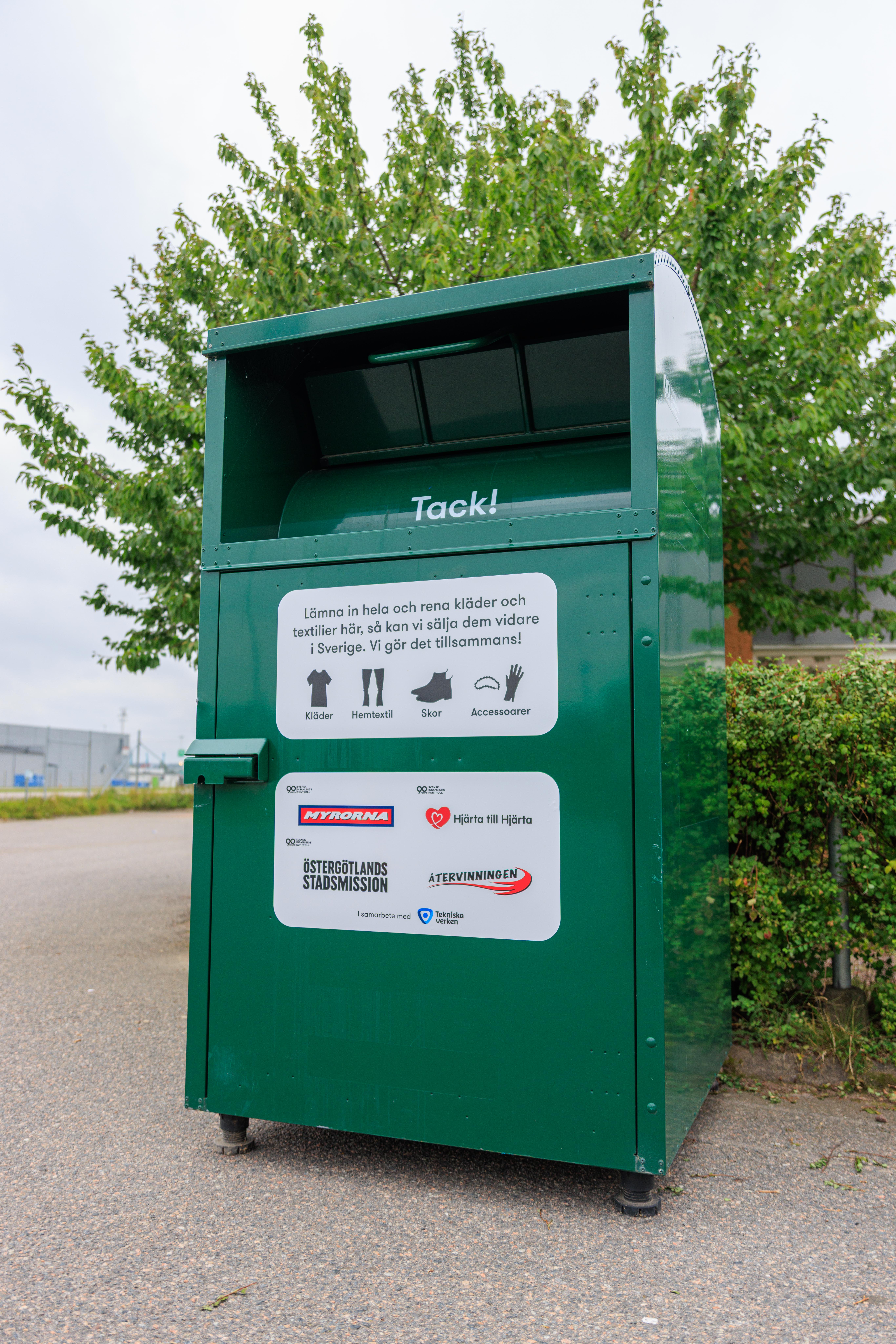 På 35 återvinningsstationer i Linköpings kommun finns nu nya textilboxar för att samla in och återanvända hela och rena textilier, som organisationerna kommer att sälja eller skänka bort.