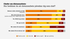 87 procent av chefskollektivet säger att de vill arbeta på distans i framtiden. Cheferna i undersökning svarade även på frågan kring distansarbete på arbetsplatsen i stort. Sju av tio chefer upplever att distansarbete påverkar medarbetarnas välmående och hälsa positivt. Samtidigt upplever lika många (nära sju av tio) att distansarbete påverkar medarbetarnas informationsutbyte och samarbete negativt.