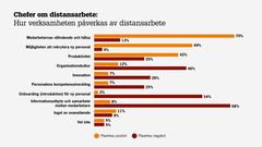 Nästan nio av tio av Sveriges chefer vill arbeta mer på distans i framtiden. De främsta fördelarna är bättre balans mellan arbete och fritid, minskad stress i det egna arbetslivet samt förbättrad hälsa och välmående bland medarbetarna. Men allt är inte positivt, samarbetet och informationsutbytet mellan medarbetarna samt innovation påverkas negativt. Det framkommer av Ledarnas kommande rapport Mot en lärande framtid.