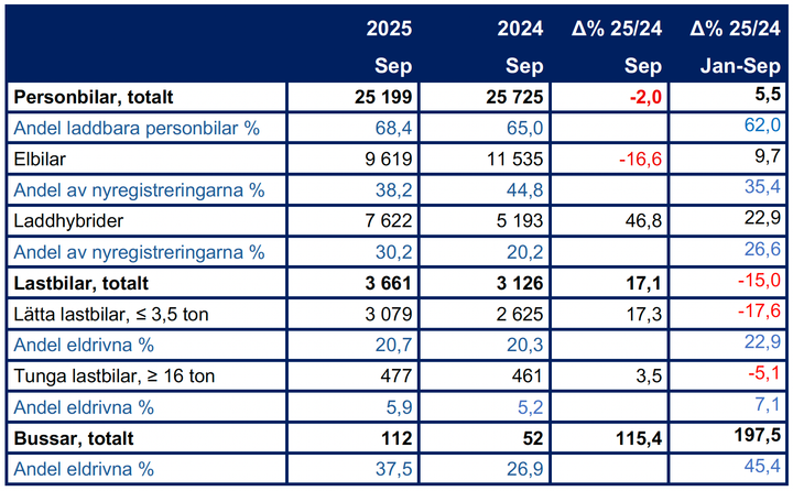 Siffrorna i texten är avrundade. Exakta siffror finns i tabellen ovan samt i filen ”Månadsrapport Nyregistreringar september 2025”, där det finns ett stort antal tabeller och diagram. Här finns även tunga lastbilars drivmedelsfördelning och personbilsregistreringar per län och kommun.