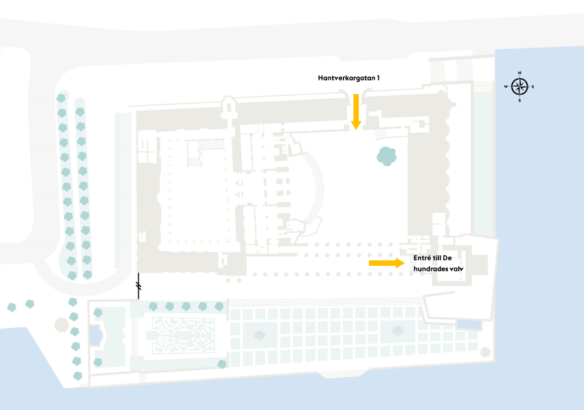 Gå in på Borgargården via valvet från Hantverkargatan 1. Entrén till pressträffen är vid De hundrades valv vid trappan på vänster sida nere vid vattnet. Se karta nedan.