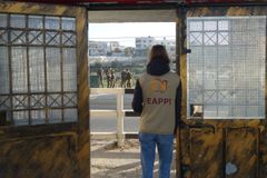 Följeslagare på plats vid porten till en skola där elever dagligen möter israeliska soldater och bosättare.