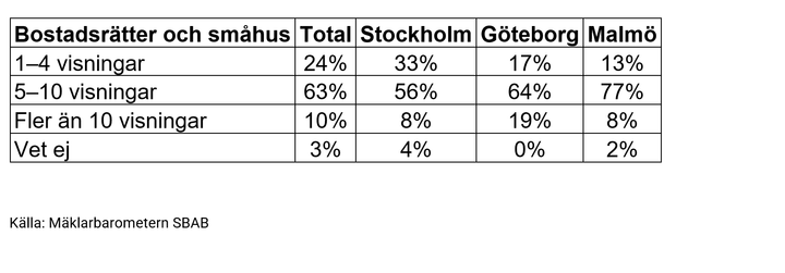 6 av 10 mäklare anger att det krävs 5–10 visningar på dagens bostadsmarknad innan bostaden är såld. I Göteborg bedöms situationen vara än mer ansträngd. Där anger nästan var femte mäklare att det krävs fler än 10 visningar.