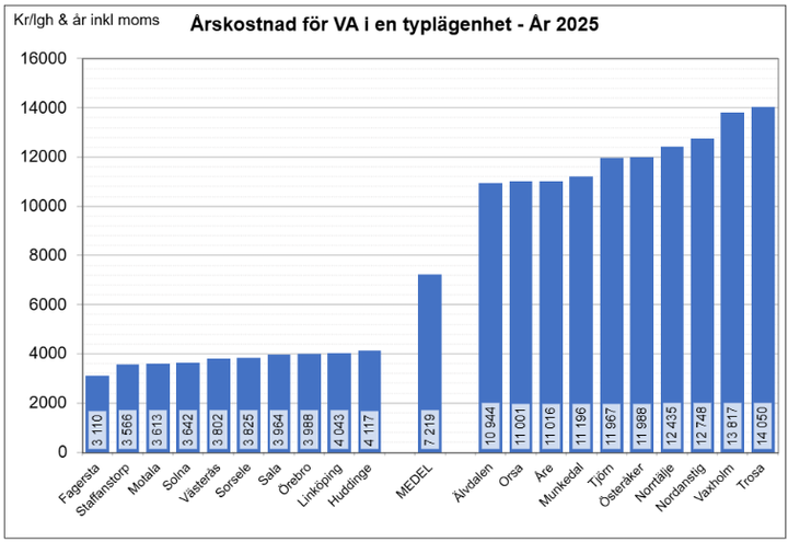 De senaste fem åren har skillnaderna mellan kommunerna ökat kraftigt. På tio år sikt har taxeutvecklingen i endast fem procent av kommunerna följt eller underskridit inflationen - de flesta har i stället gjort kraftiga höjningar. Bland de högsta VA-kostnaderna hittas fortsatt kommuner som Norrtälje, Vaxholm och Nordanstig där kostnaden för en normalstor lägenhet ligger över 12 000 kronor per år. I den absoluta pristoppen har vi dock en ny kommun. Trosa gör en höjning på 39 procent vilket ger en årskostnad på drygt 14 000 kronor per år och lägenhet. I andra änden av skalan ligger Fagersta, som trots en höjning på 9 procent endast har en årskostnad på ca 3 100 kronor per år och lägenhet.