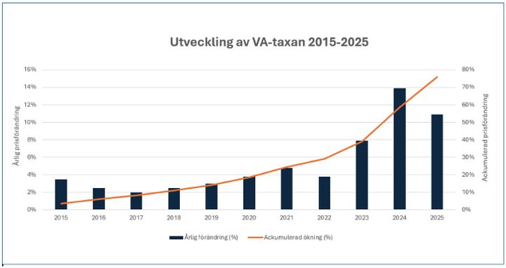 Kostnaden för vatten och avlopp ökar kraftigt i hela landet. Totalt gör 139 kommuner höjningar på över tio procent, medan bara sex kommuner sänker taxan. Det visar Nils Holgerssongruppens årliga kartläggning. I genomsnitt höjer landets kommuner VA-taxorna med 10,9 procent i år jämfört med 2024. Det här är den näst högsta höjningen sedan Nils Holgerssongruppen började granska taxorna för trettio år sedan.