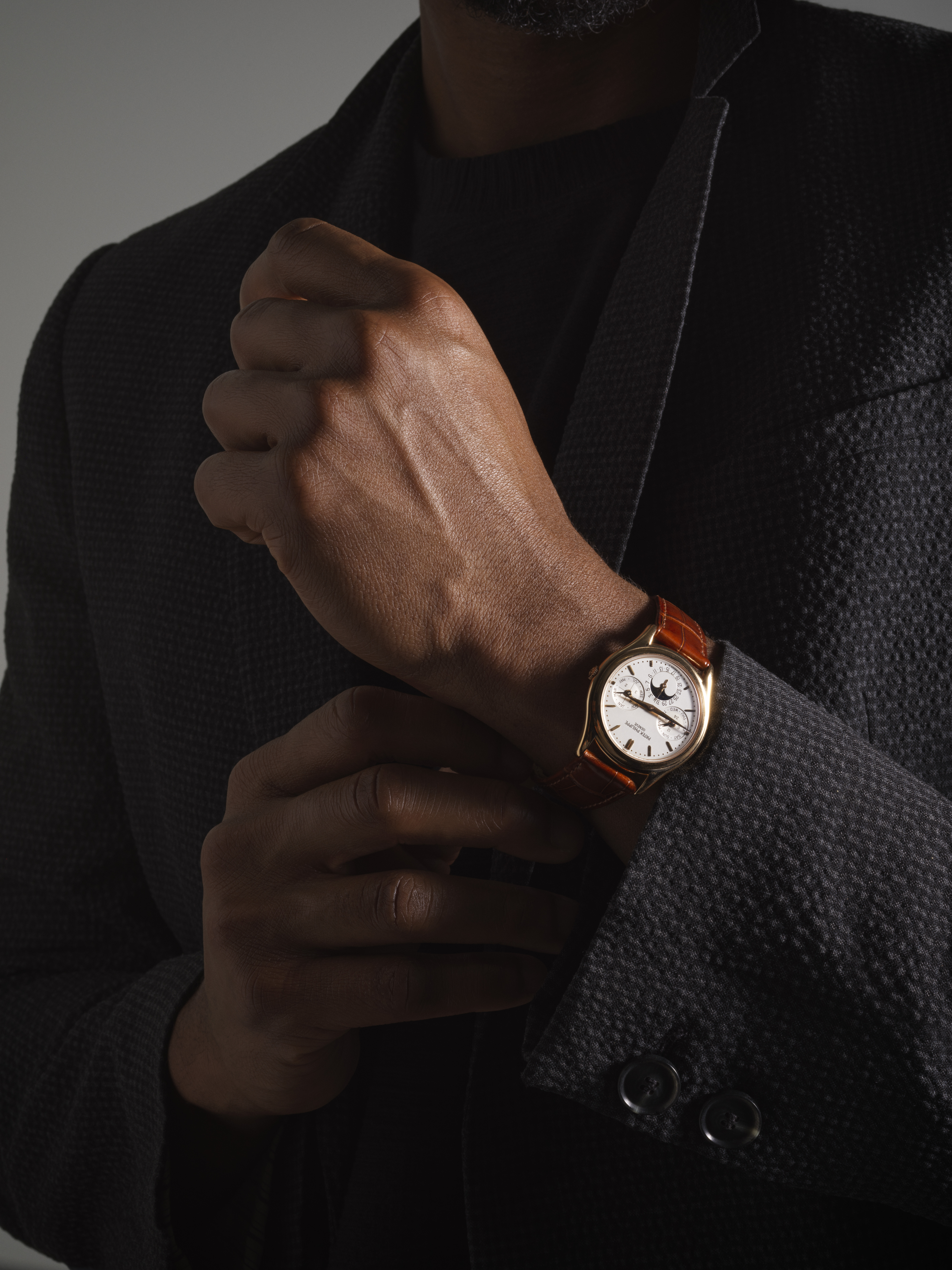 Bland höjdpunkterna återfinns en Patek Philippe kronograf i platina, referens 5170P med baguetteformade diamantindex, samt en Patek Philippe Perpetual Calendar ref. 3940 i roséguld, en av tillverkarens mest uppskattade evighetskalendrar. Vidare presenteras flera varianter av Patek Philippe Aquanaut, däribland den ovanliga ref. 5165A, samt den ikoniska Audemars Piguet Royal Oak ref. 5402, den första generationen av Gérald Gentas banbrytande design.