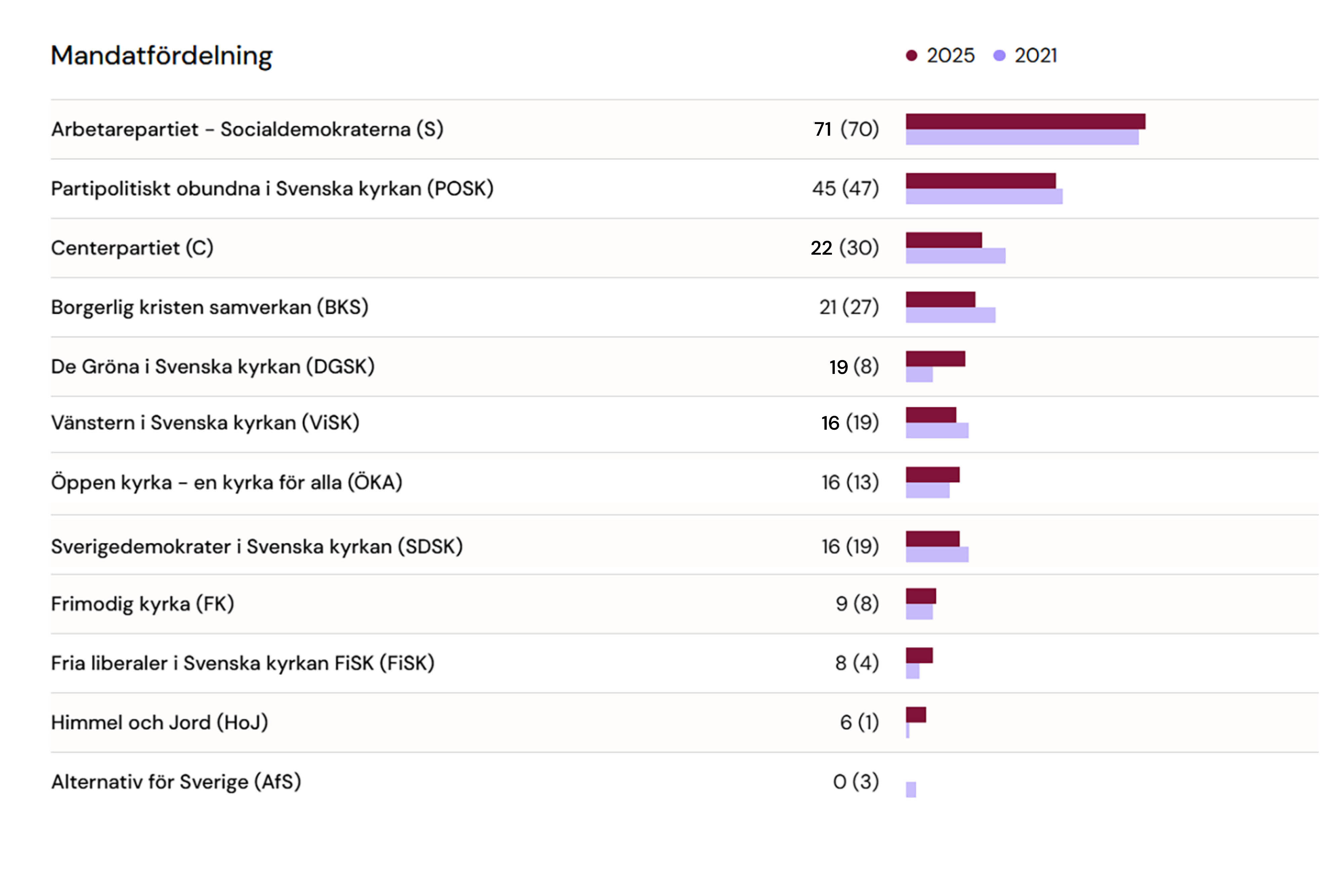 As of this year’s elections, a new seat threshold applies, which means that nomination groups must have received at least two percent of the votes to win a seat on the General Synod. Himmel och Jord (HoJ) (Heaven and Earth) crossed this threshold to win six seats, while Alternativ för Sverige (AfS) (Alternative for Sweden) won no seats.