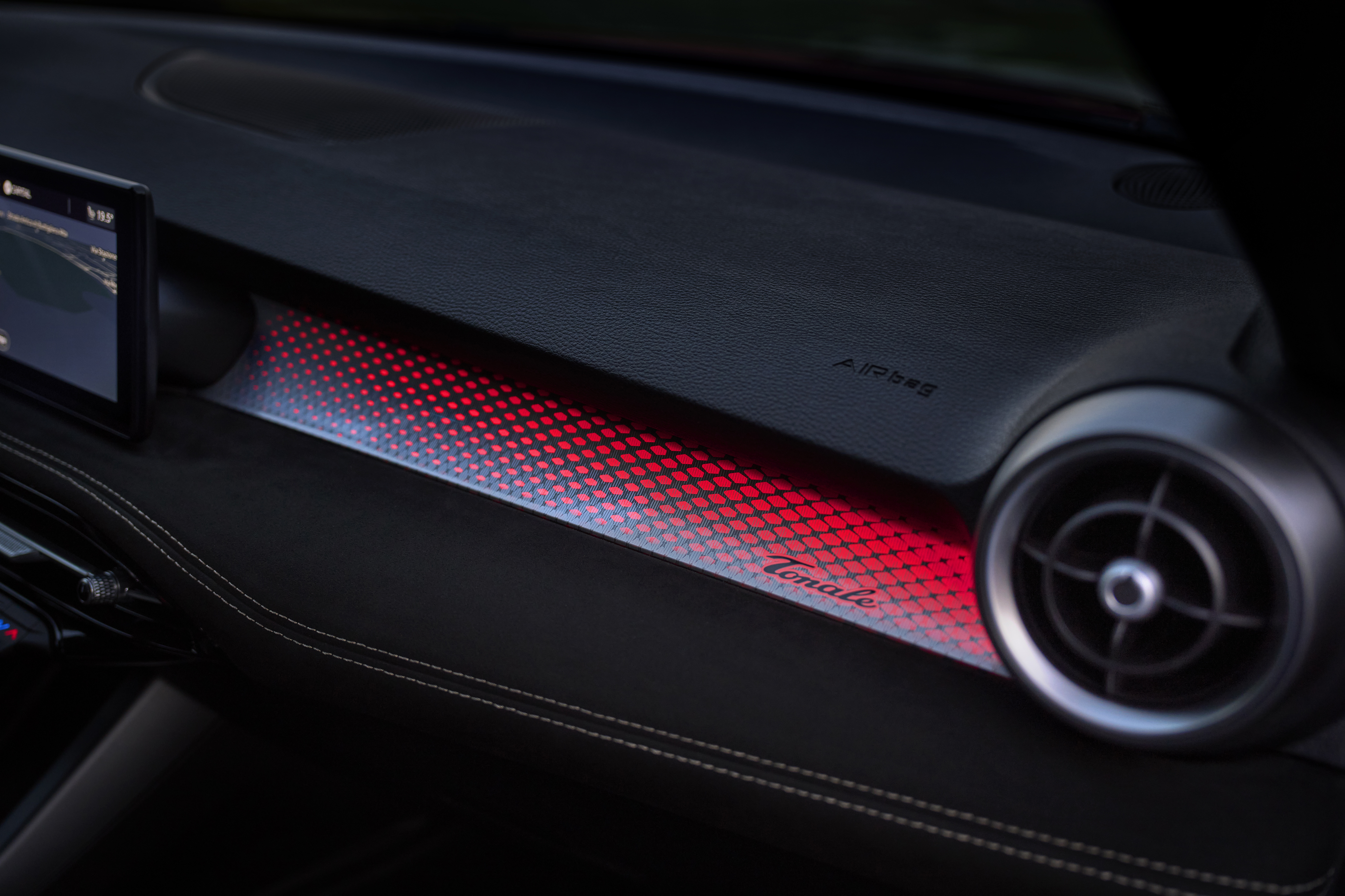 Sport Speciale-versionen, lanseringsutgåvan, bjuder på en unik ambientbelysning inspirerad av Alfa Romeos berömda biscione-symbol och exklusiva Alcantara-säten, som ger extra karaktär och modernitet till kupén.