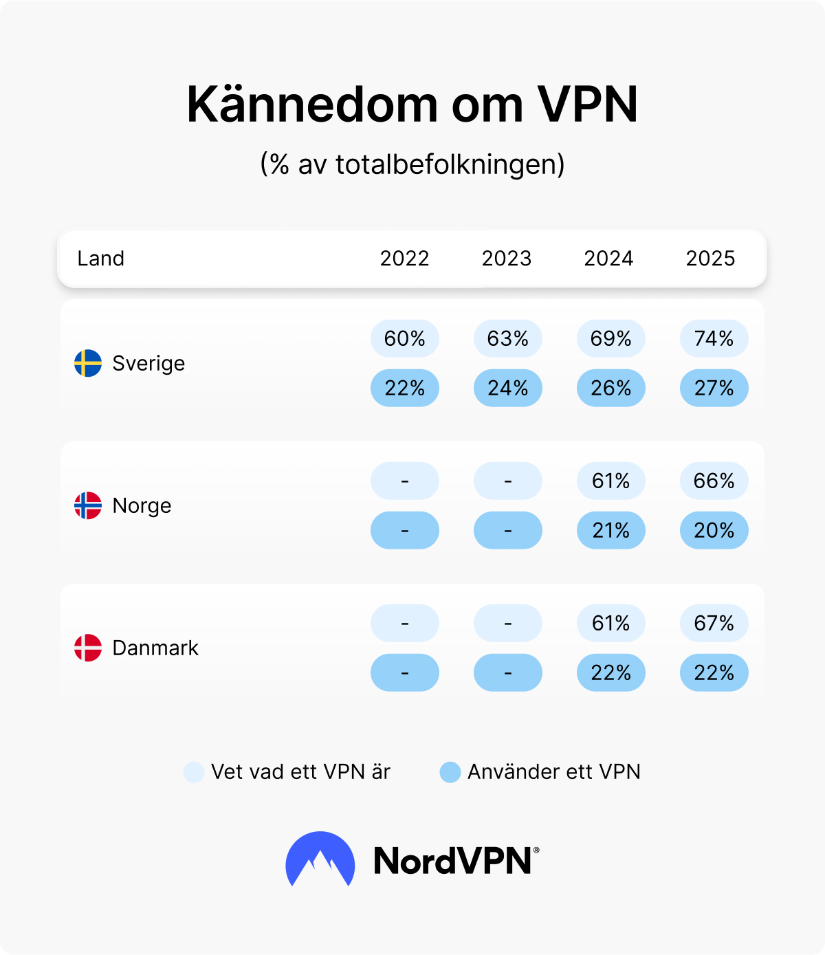 Svenskarna står sig fortfarande bättre än sina nordiska grannar, trots att skillnaden är marginell. Bland danskar och norskar är det endast var femte (22 procent i Danmark och 20 procent i Norge) som uppger att de använder en VPN-tjänst.