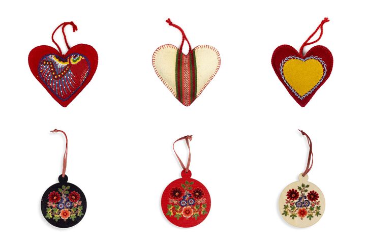 Julens dekorationer omfattar även svensktillverkade handsydda och broderade hjärtan, klassiska pappersrader i gammaldags stil samt julhängen i trä, halm och ull. En nyhet för i år är julgranskulor med Skansenbutikens egna Dalafloda-motiv – ett mönster djupt förankrat i svensk slöjdtradition. De svensktillverkade tomtarna finns i flera traditionella utföranden och är en självklar del av sortimentet.