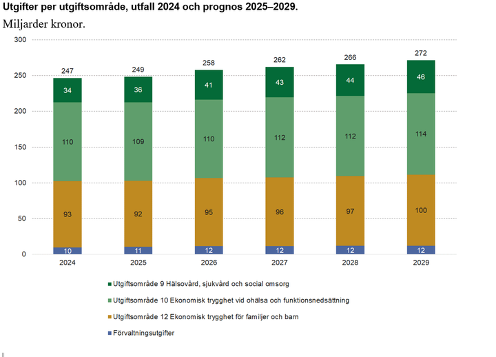 Totalt beräknas utgifterna för socialförsäkringen för år 2025 bli 249 miljarder, en ökning med 2 miljarder kronor. De beräknade utgifterna står för knappt 17,5 procent av de 1 426 miljarder som utgör statens totala budgeterade utgifter för året.