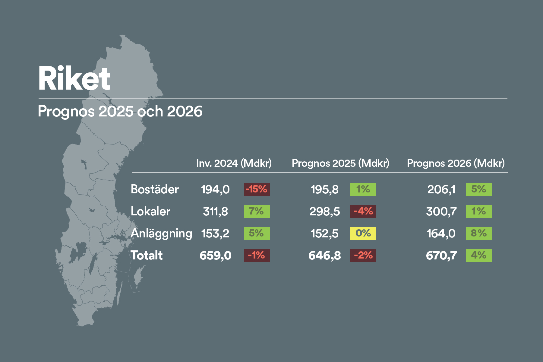 Sammantaget ökar investeringarna i bostäder, lokaler och anläggningar med knappt två procent över prognosperioden - till 670,7 miljarder kronor 2026. Sysselsättningen inom bygg- och anläggning stiger med 1 200 personer till 369 500.