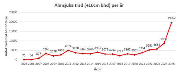 Årets inventering har också varit mer omfattande med 18 personer som jobbat för att lokalisera smittade almar, men det förklarar bara en del av ökningen.