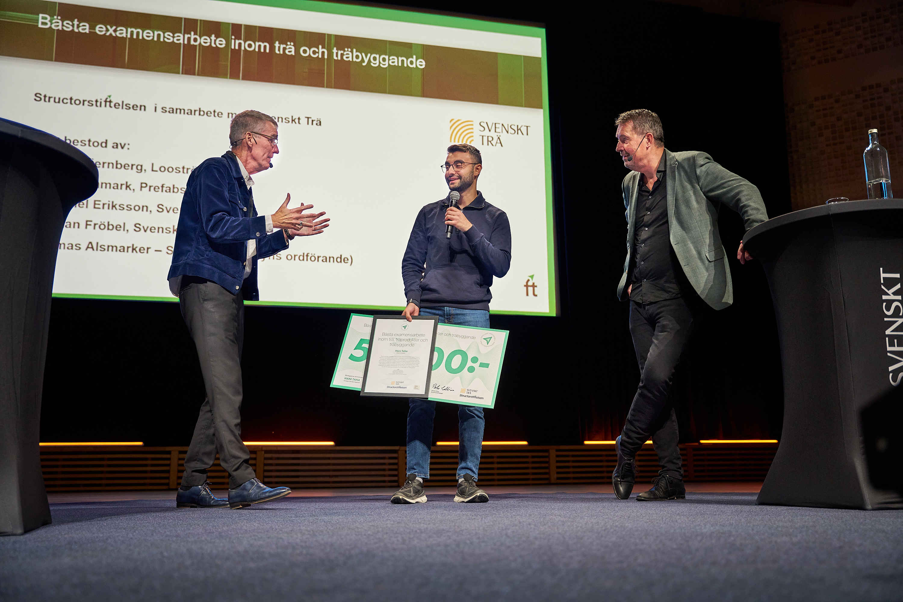 – Examensarbetet har analyserat beteendet hos slanka konstruktioner i trä och samtidigt identifierat i vilka situationer Eurokoden inte beskriver fenomenet på ett korrekt sätt. Hani Tana har dessutom föreslagit hur denna skillnad kan hanteras och beräknas i praktiken, säger juryns ordförande Tomas Alsmarker, chef för innovation och forskning på Svenskt Trä.
