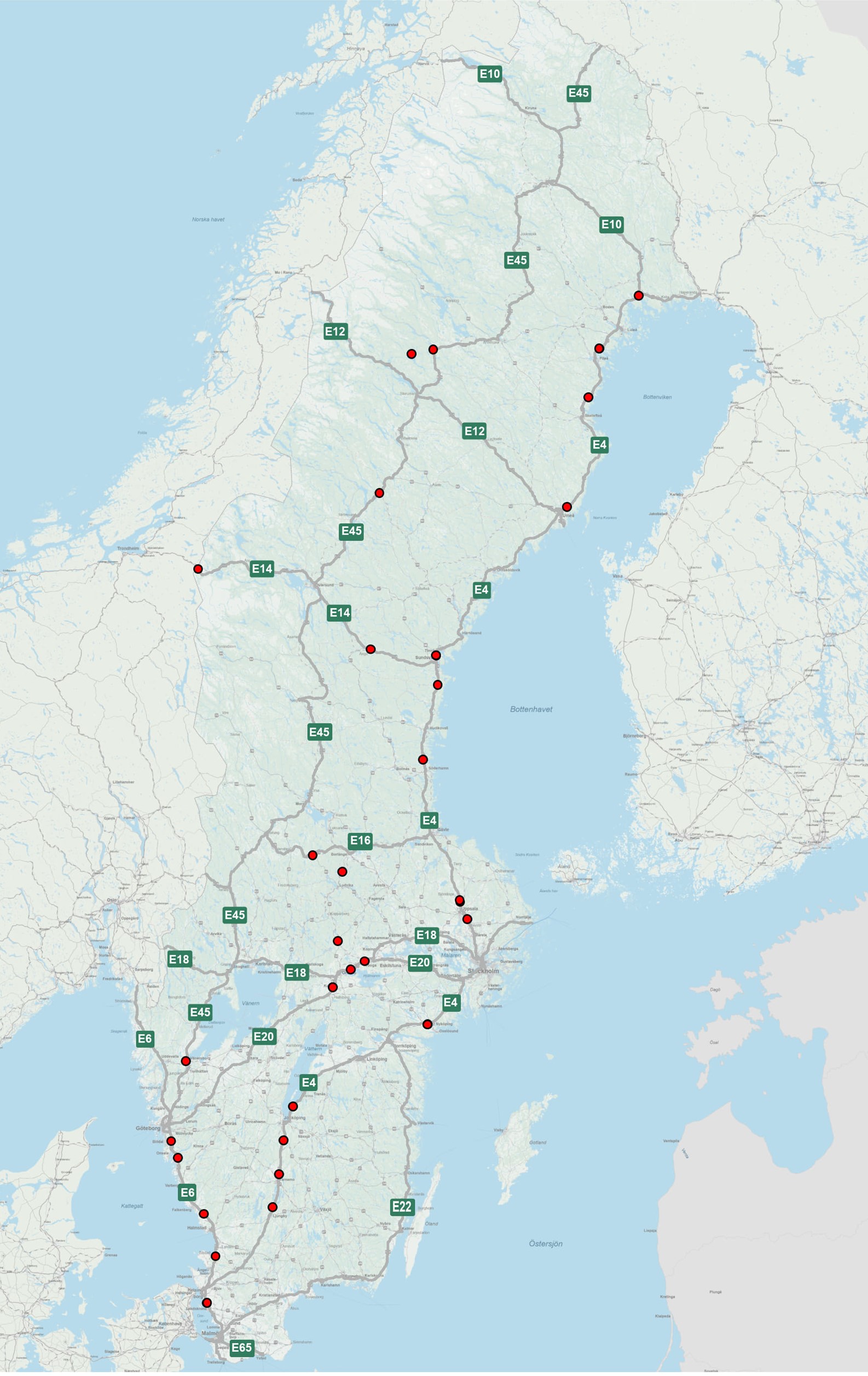 De 31 utpekade rastplatserna är strategiskt viktiga för vägtransporter genom hela landet och har minst åtta platser för lastbil och släp. Markytan är så stor att det med vissa åtgärder går att komplettera dem med laddning för olika typer av fordon, utan att försämra dagens kapacitet för icke laddbara fordon.
